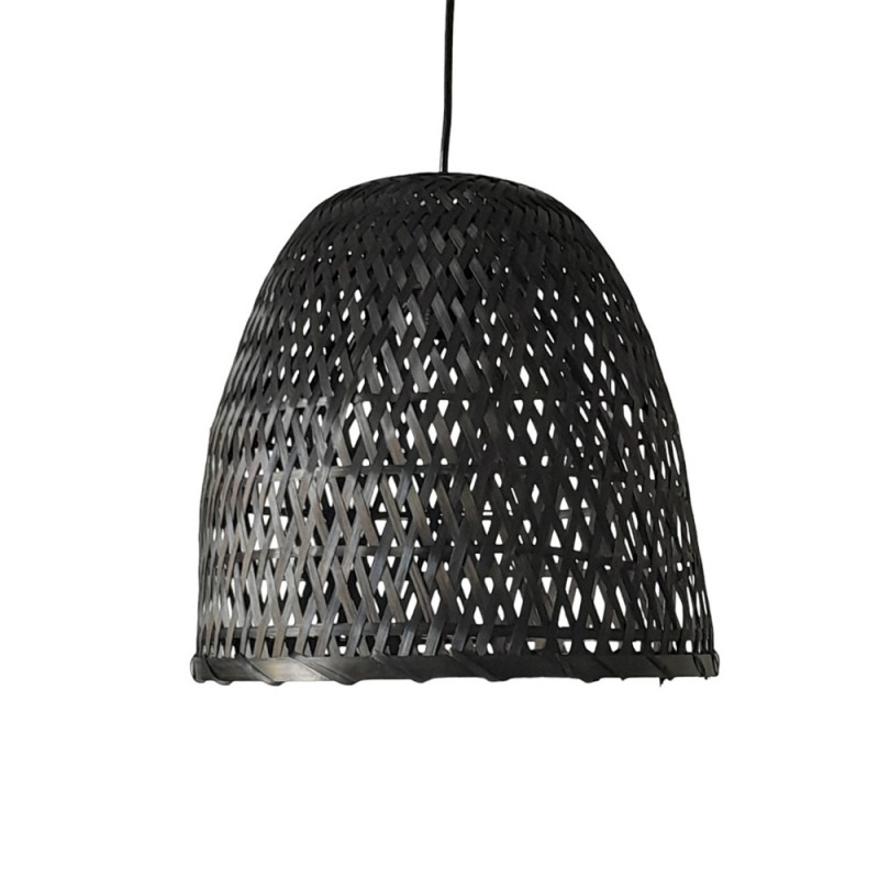 Pantalla de bambú color negro para lámpara de techo. Diseño en forma de cúpula con bambú trenzado dejando pasar ligeramente la luz en el entorno. Se debe combinar con un portalámparas para crear una lámpara colgante.