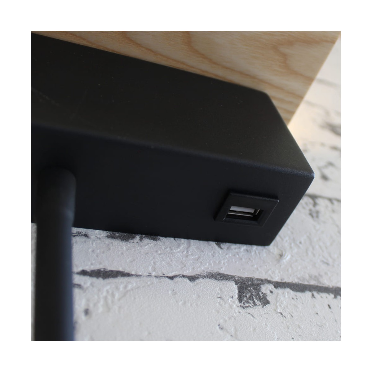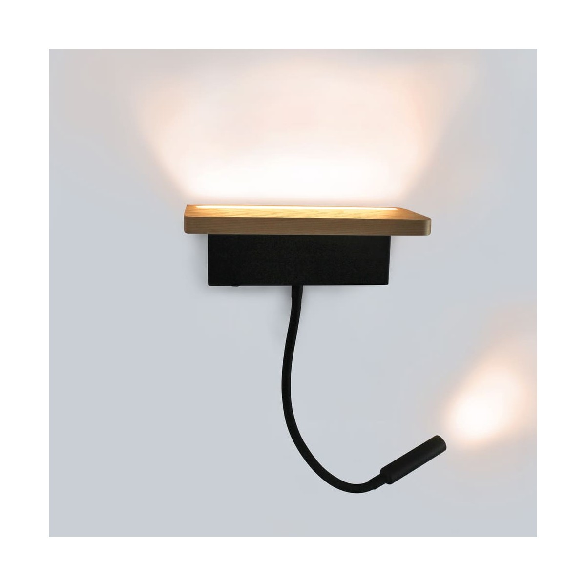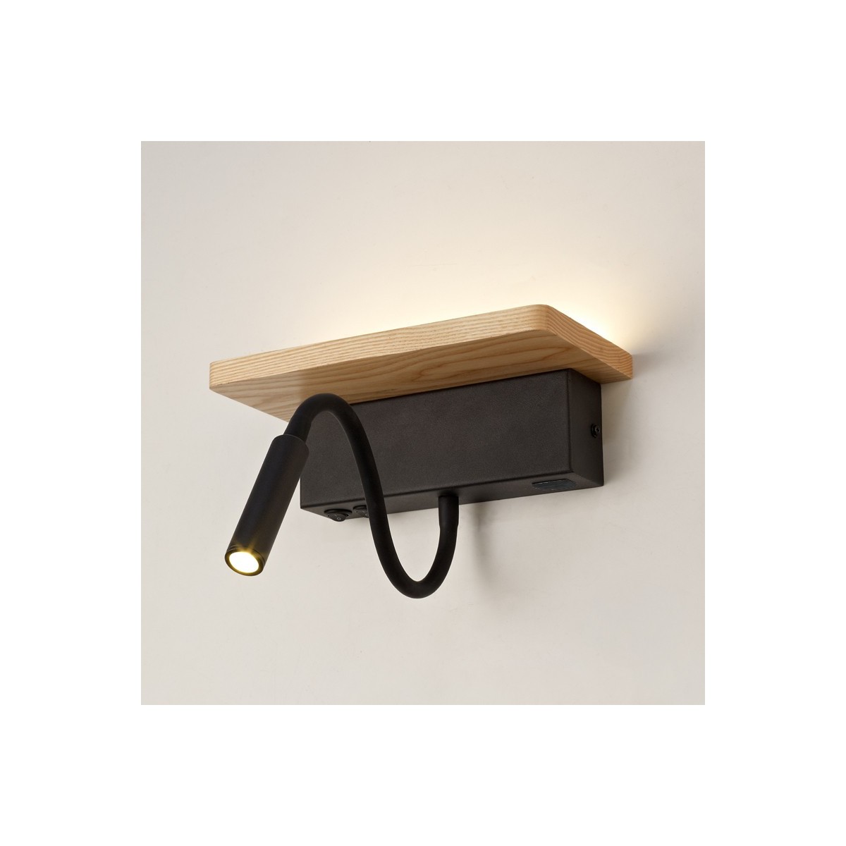 Aplique de pared con doble iluminación LED de 5W+3W con luz cálida (3000K), driver incluido. La luz fija tiene una potencia de 5W. Dispone de un interruptor para cada luz y un puerto USB muy práctico. Encima del aplique la superficie de madera puede utilizarse como pequeña repisa auxiliar. El brazo del foco auxiliar es completamente flexible permitiendo orientar la iluminación.