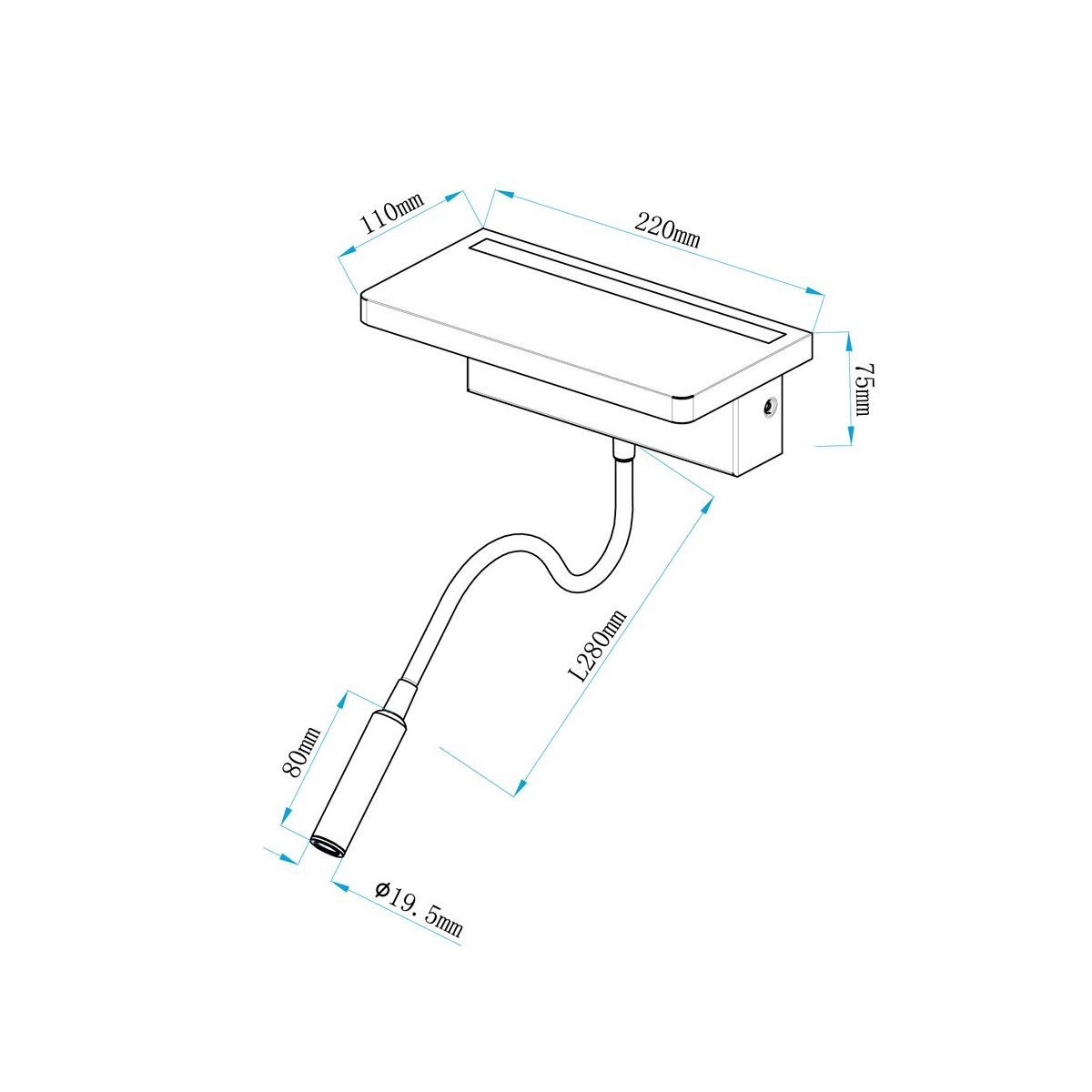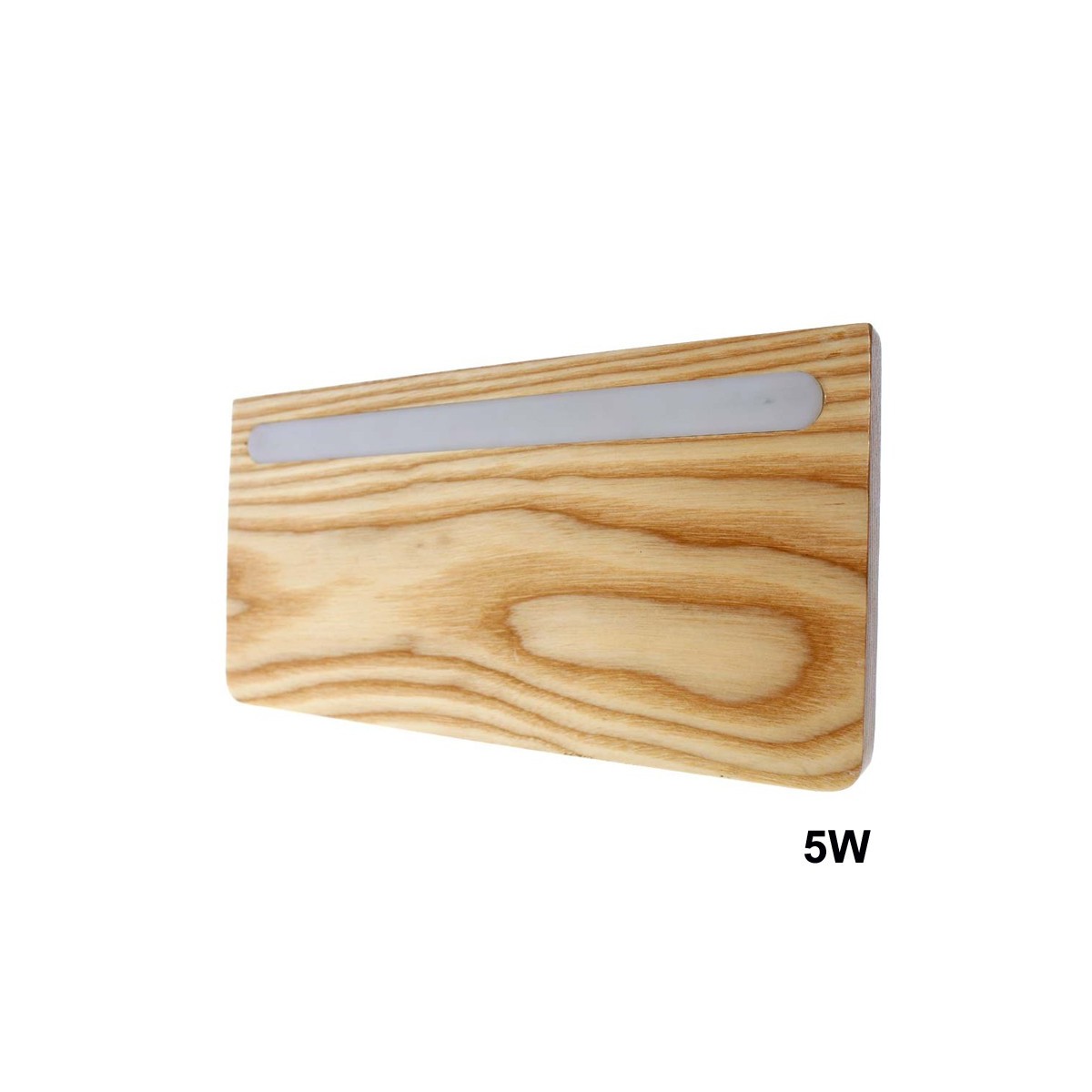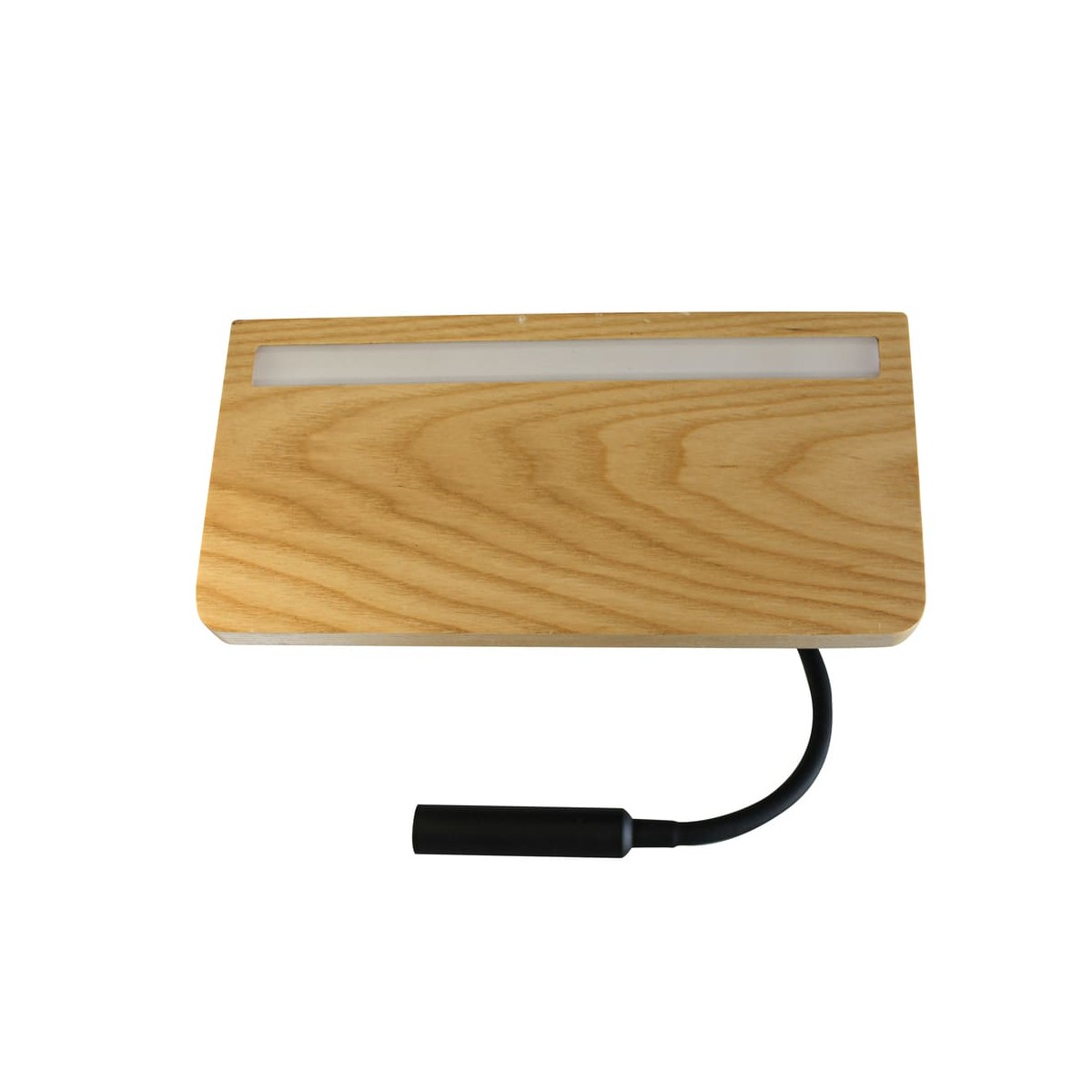 Aplique de pared con doble iluminación LED de 5W+3W con luz cálida (3000K), driver incluido. La luz fija tiene una potencia de 5W. Dispone de un interruptor para cada luz y un puerto USB muy práctico. Encima del aplique la superficie de madera puede utilizarse como pequeña repisa auxiliar. El brazo del foco auxiliar es completamente flexible permitiendo orientar la iluminación.