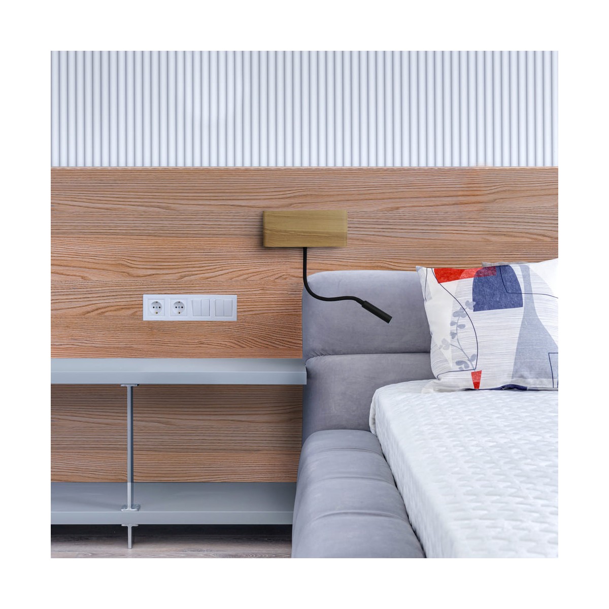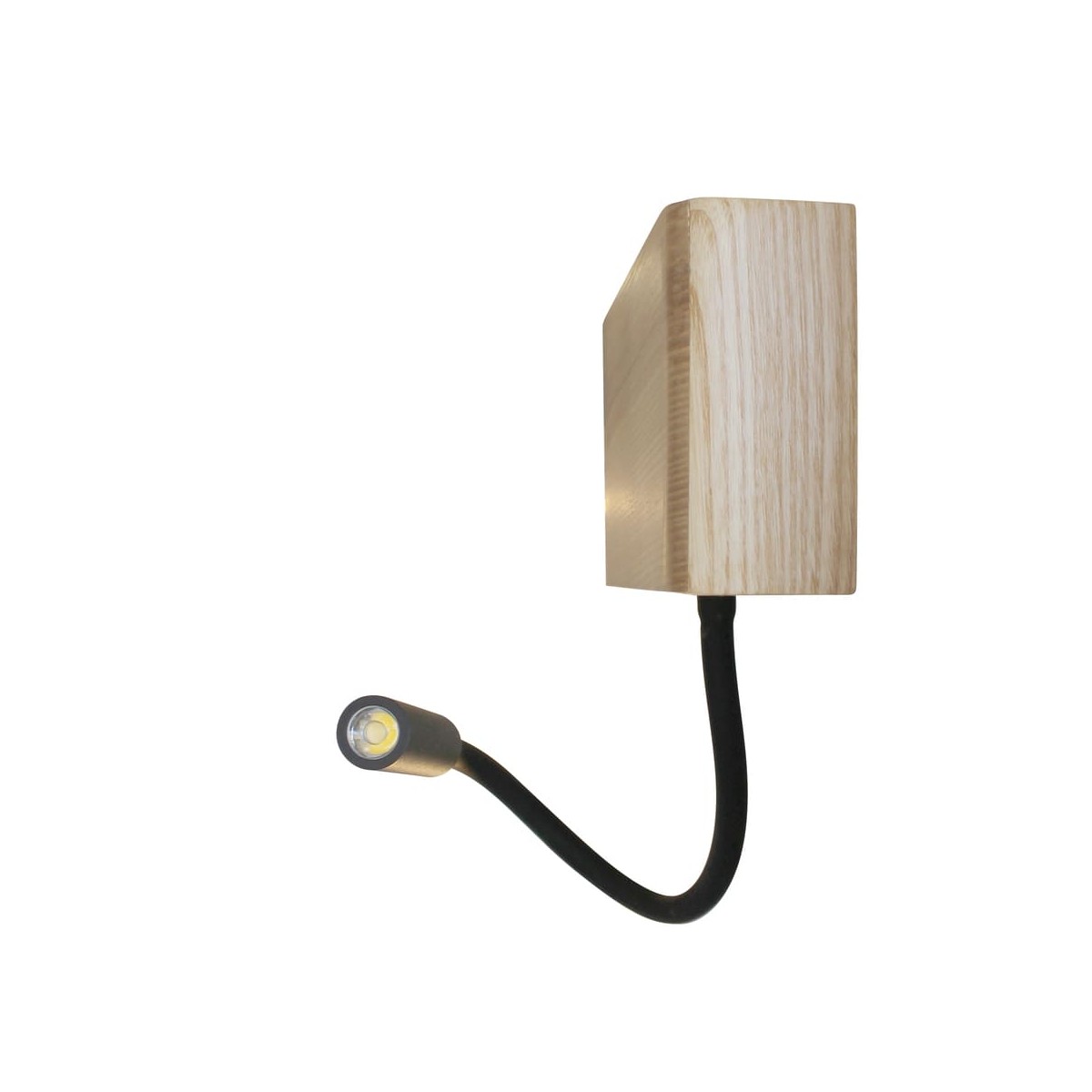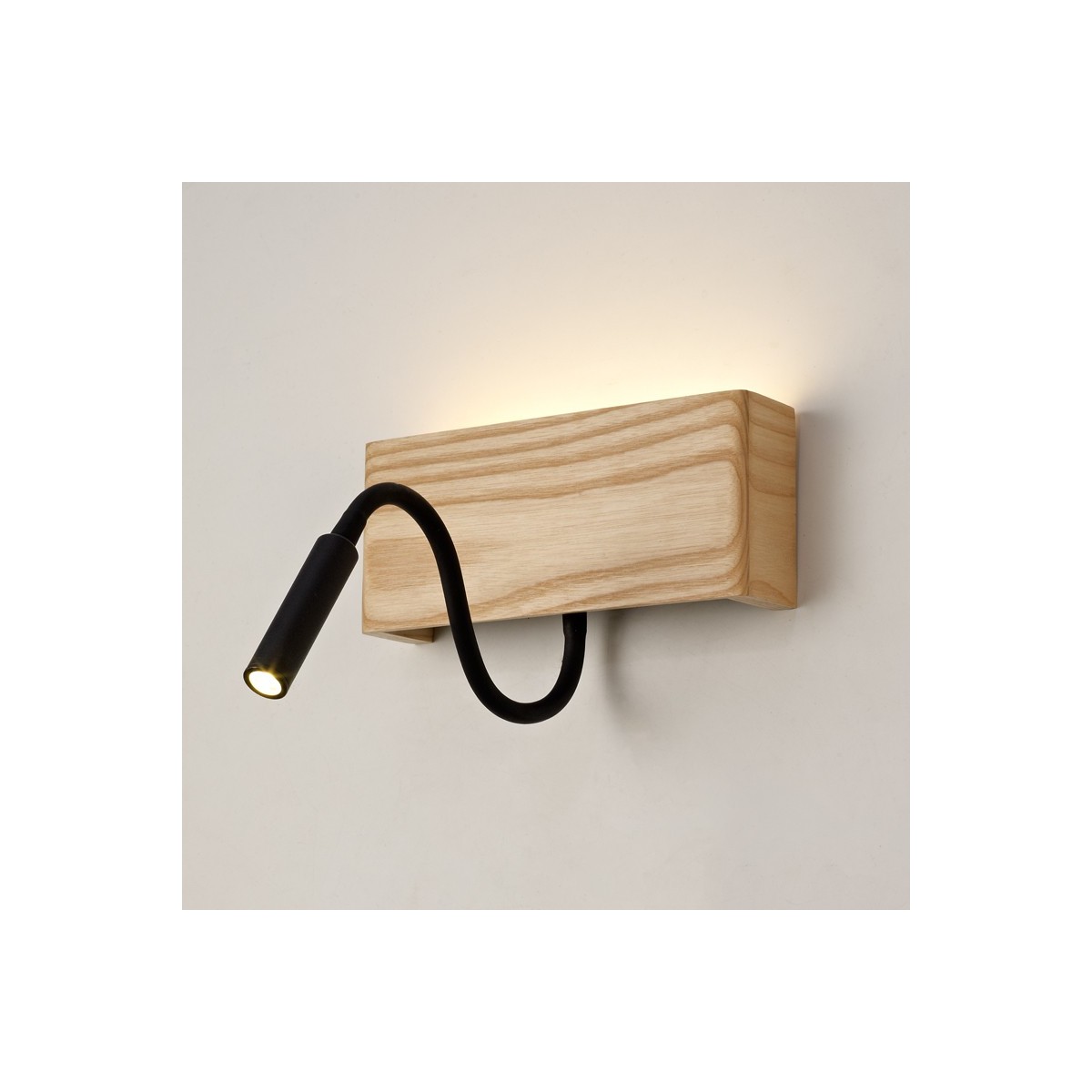 Aplique de pared con doble iluminación LED de 5W+3W con luz cálida (3000K). El foco orientable tiene una potencia de 3W. Dispone de un interruptor para cada luz y un puerto USB muy práctico. El brazo del foco auxiliar es completamente flexible permitiendo orientar la iluminación.