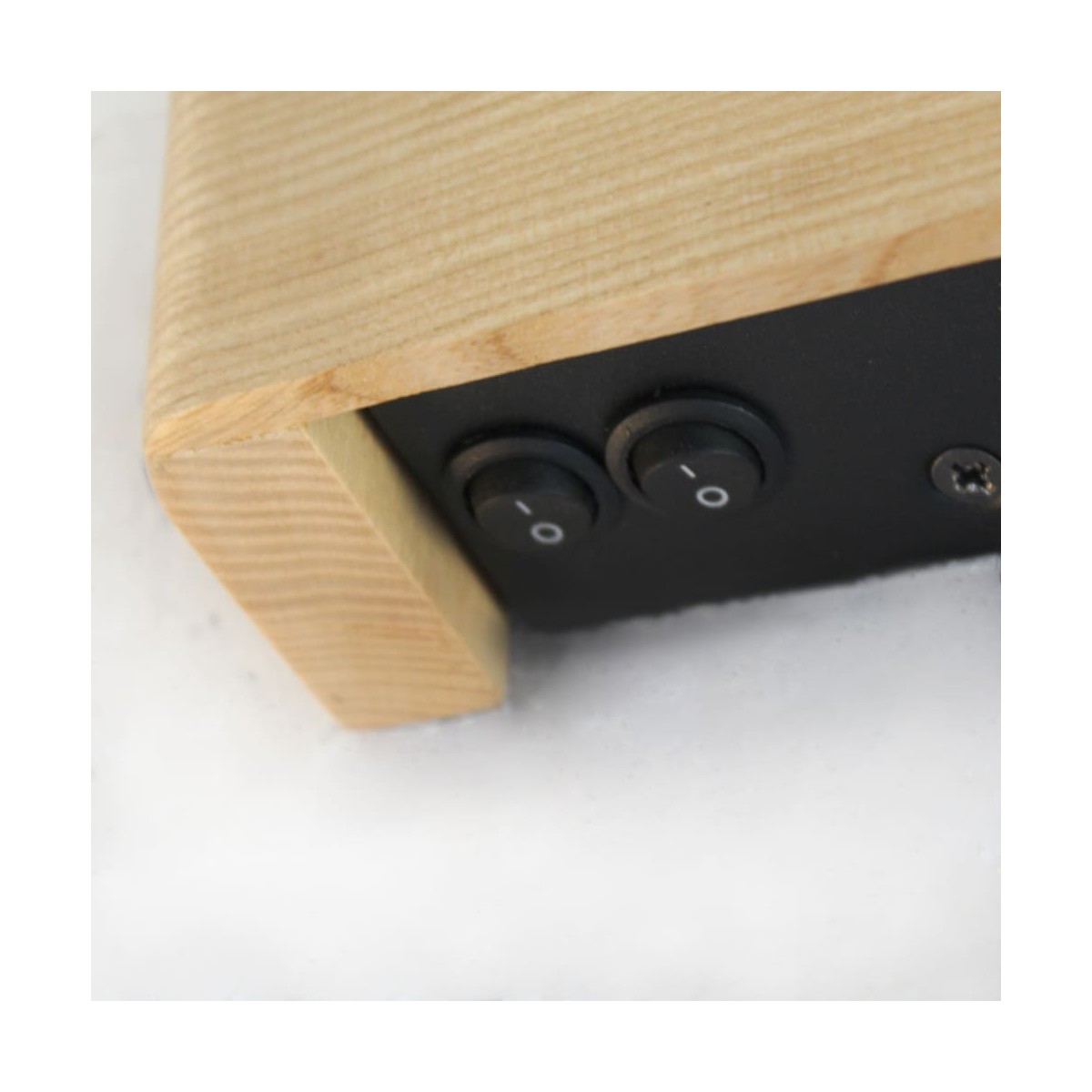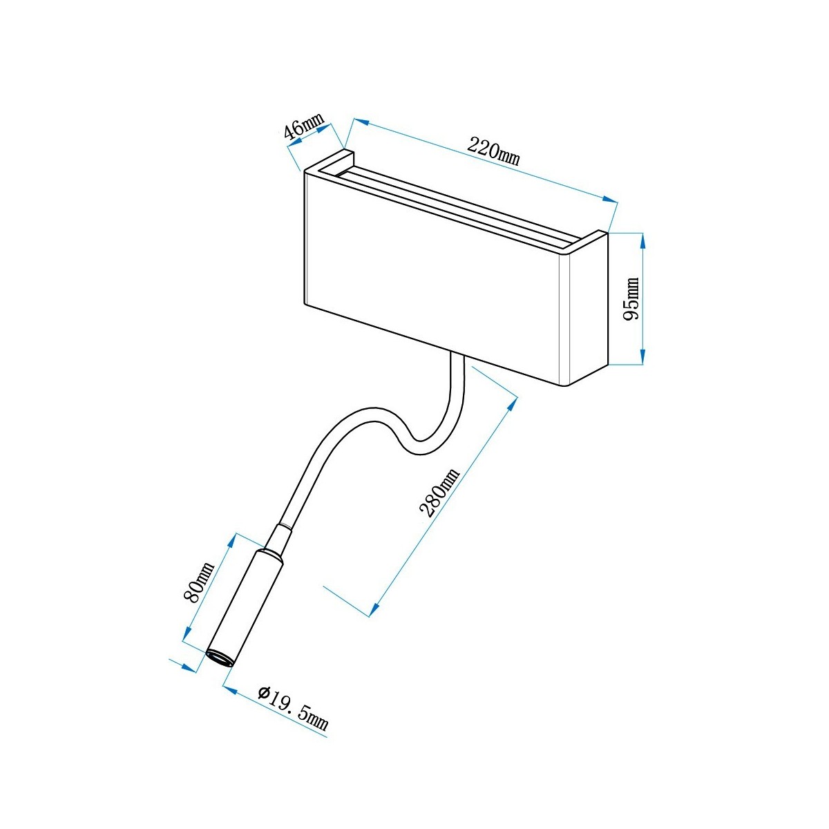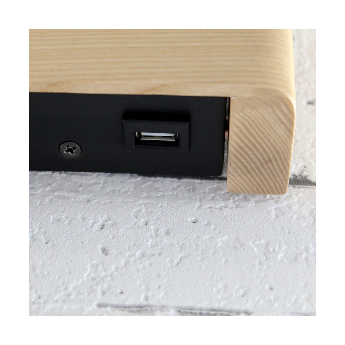 Aplique de pared con doble iluminación LED de 5W+3W con luz cálida (3000K). El foco orientable tiene una potencia de 3W. Dispone de un interruptor para cada luz y un puerto USB muy práctico. El brazo del foco auxiliar es completamente flexible permitiendo orientar la iluminación.