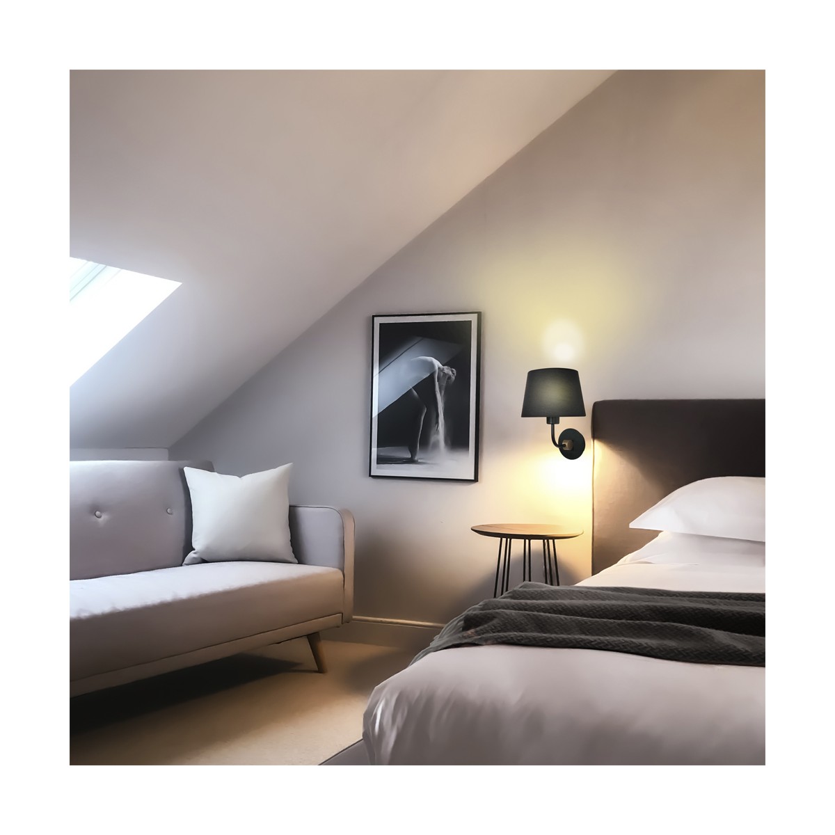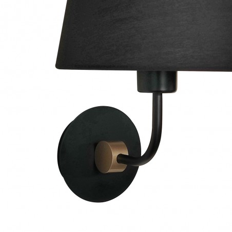 Aplique de pared para recibidores, pasillos y dormitorios. Diseño minimalista con base metálica y pantalla de tela de color negro. Tiene un pequeño detalle en color dorado en la base. Puedes instalar un aplique a cada lado de la cama como iluminación.