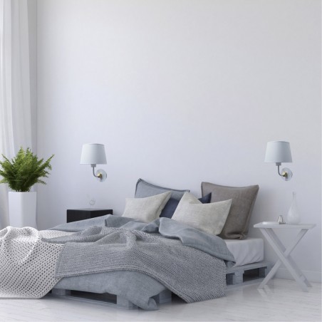 Aplique de pared para recibidores, pasillos y dormitorios. Diseño minimalista con base metálica y pantalla de tela de color blanco. Tiene un pequeño detalle en color dorado en la base. Puedes instalar un aplique a cada lado de la cama como iluminación.