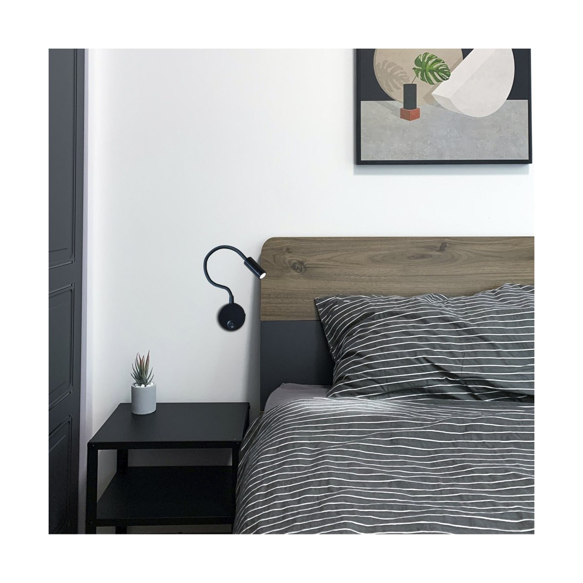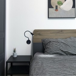 Aplique de pared flexible para el dormitorio. Aplique de pared diseñado para utilizar como luz auxiliar o de lectura junto al cabecero de la cama. Estructura flexible, punto de luz LED focalizado e interruptor ON/OFF en la base. Perfecto para proyectos contract en habitaciones de hoteles colocando uno a cada lado del cabecero de la cama. Fabricado en aluminio de color negro con cuerpo flexible. Iluminación LED con temperatura de color blanca cálida (3000K).