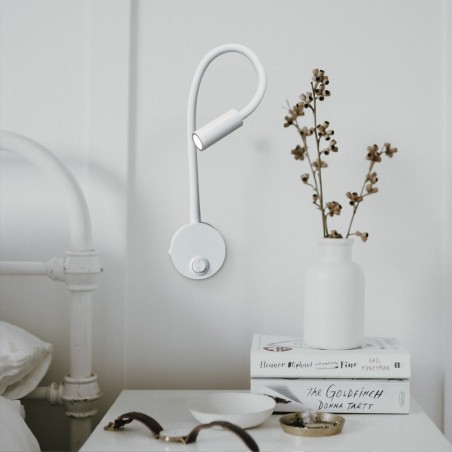 Aplique de pared flexible para el dormitorio. Aplique de pared diseñado para utilizar como luz auxiliar o de lectura junto al cabecero de la cama. Estructura flexible, punto de luz LED focalizado e interruptor ON/OFF en la base. Perfecto para proyectos contract en habitaciones de hoteles colocando uno a cada lado del cabecero de la cama. Fabricado en aluminio de color blanco con cuerpo flexible. Iluminación LED con temperatura de color blanca cálida (3000K).