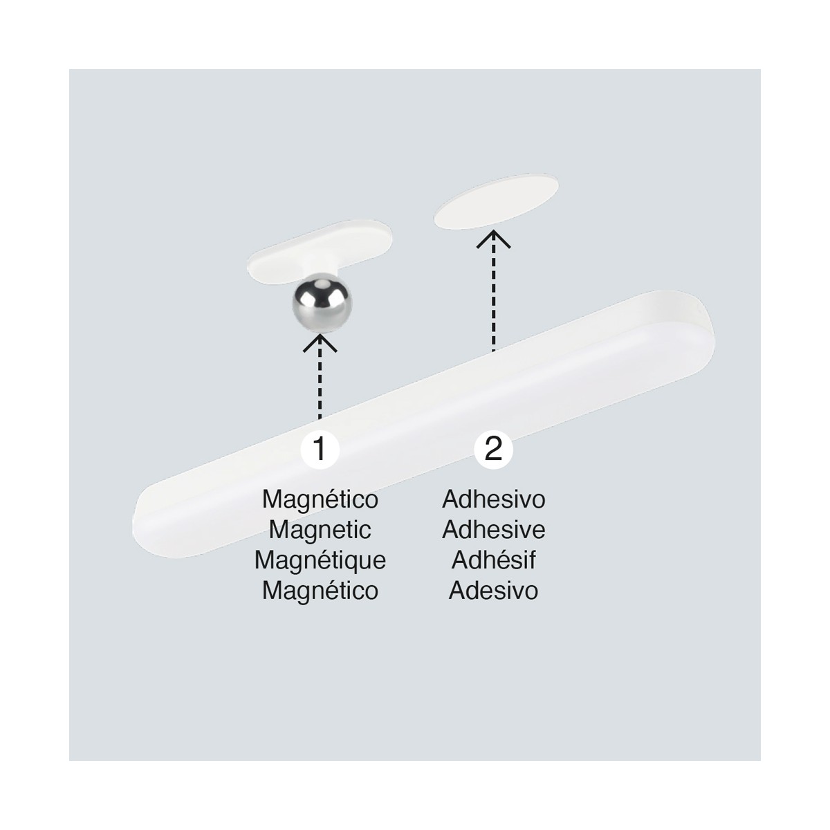 Aplique de pared con batería recargable. Práctico y versátil aplique el cual se coloca en su soporte de la pared mediante imantación. De este modo, puede orientarlo en todas las direcciones pivotando en la pieza esférica imantada. La luz se enciende fácilmente pulsado en uno de los lados del aplique. Fácil instalación y uso sin conectar a la luz gracias a su batería recargable (cable USB-C).