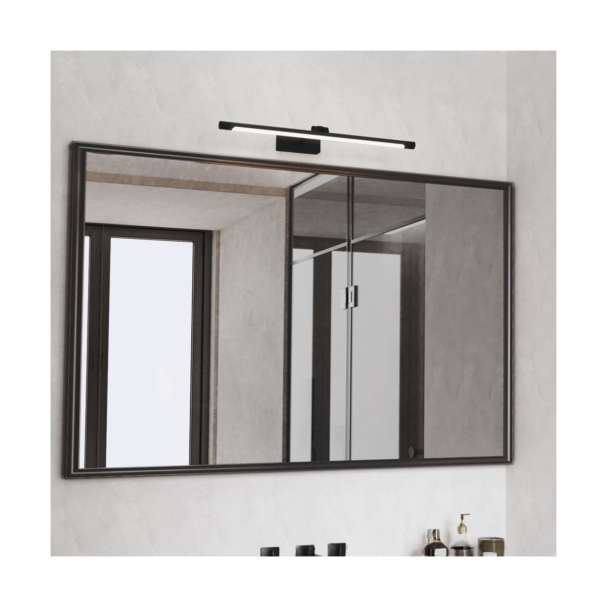 Aplique de pared para colocar sobre el espejo del baño. Aplique de pared LED con luz blanca neutra para utilizar como iluminación en el día a día frente al espejo. Lleva integrada iluminación LED con temperatura de color blanca neutra (4000K). Fabricado en aluminio de color negro con difusores de policarbonato. IP44.