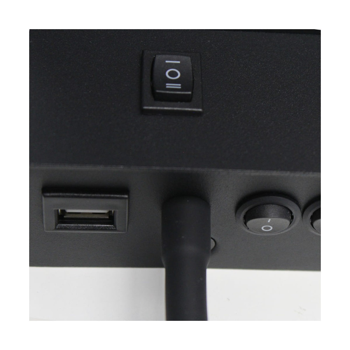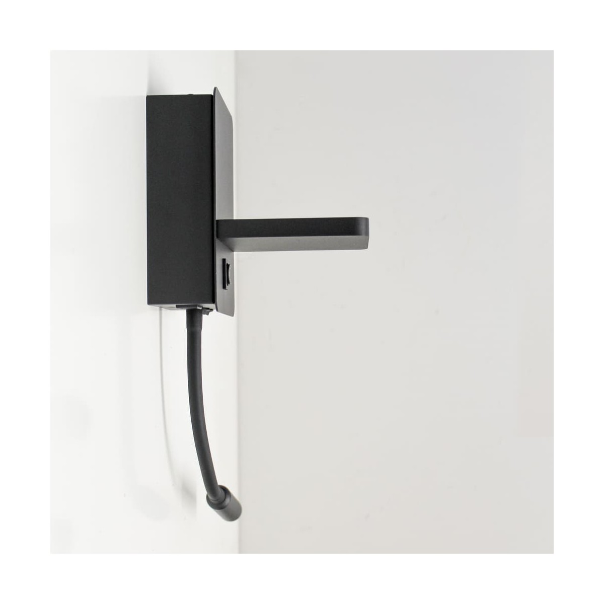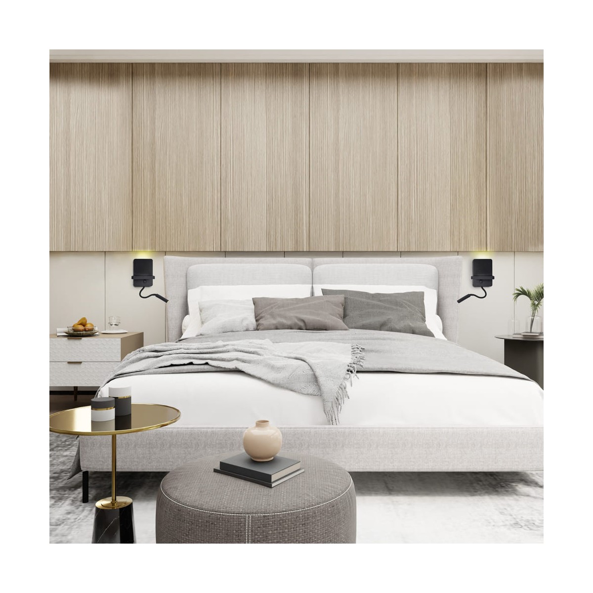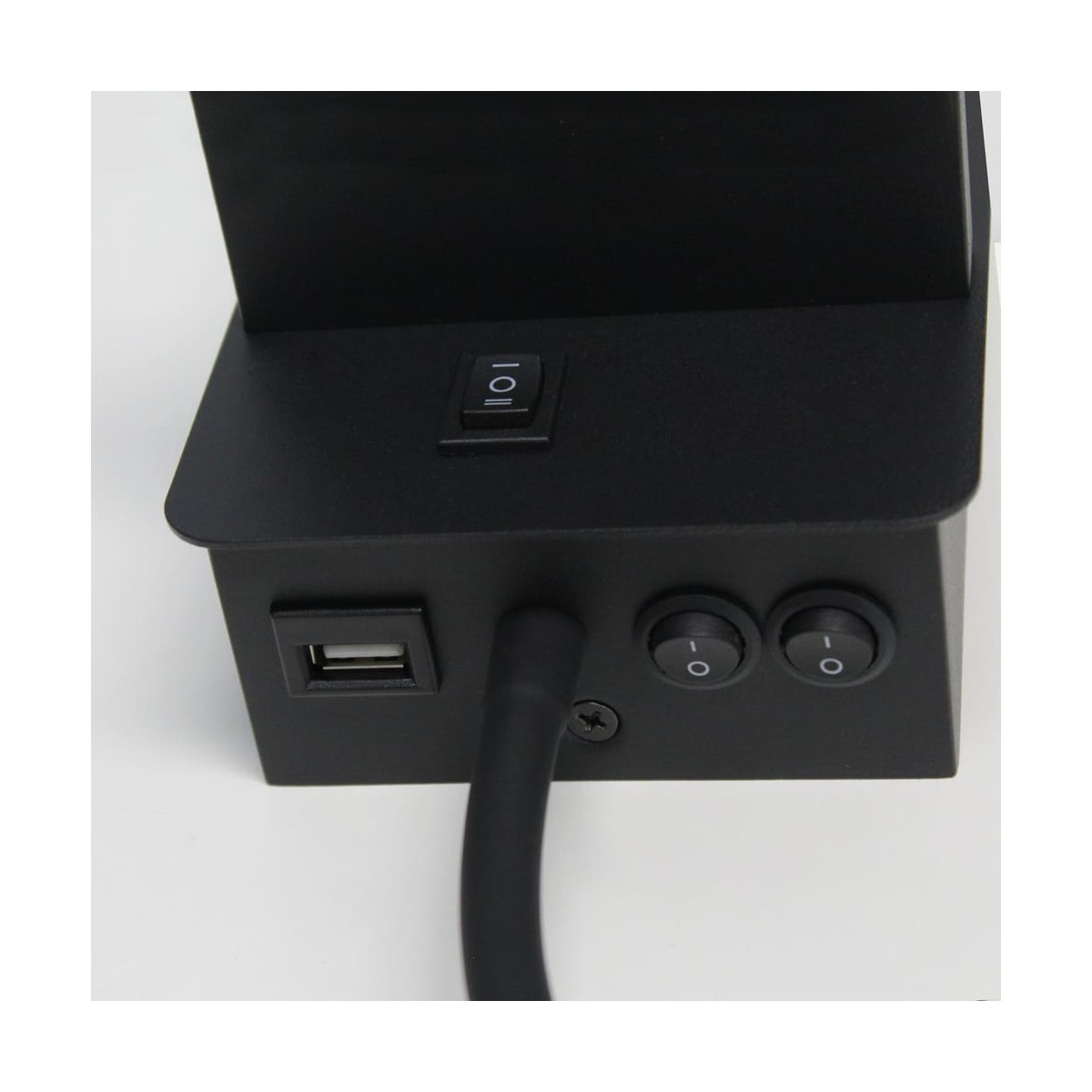 Aplique de pared con dos luces LED cálidas independientes de 5W+3W. Dispone de un interruptor para cada luz, un puerto USB muy práctico de 5W 2000mA y un cargador wireless para móviles compatibles que funciona independientemente de la luz. El foco auxiliar permite orientar la iluminación con el brazo flexible.