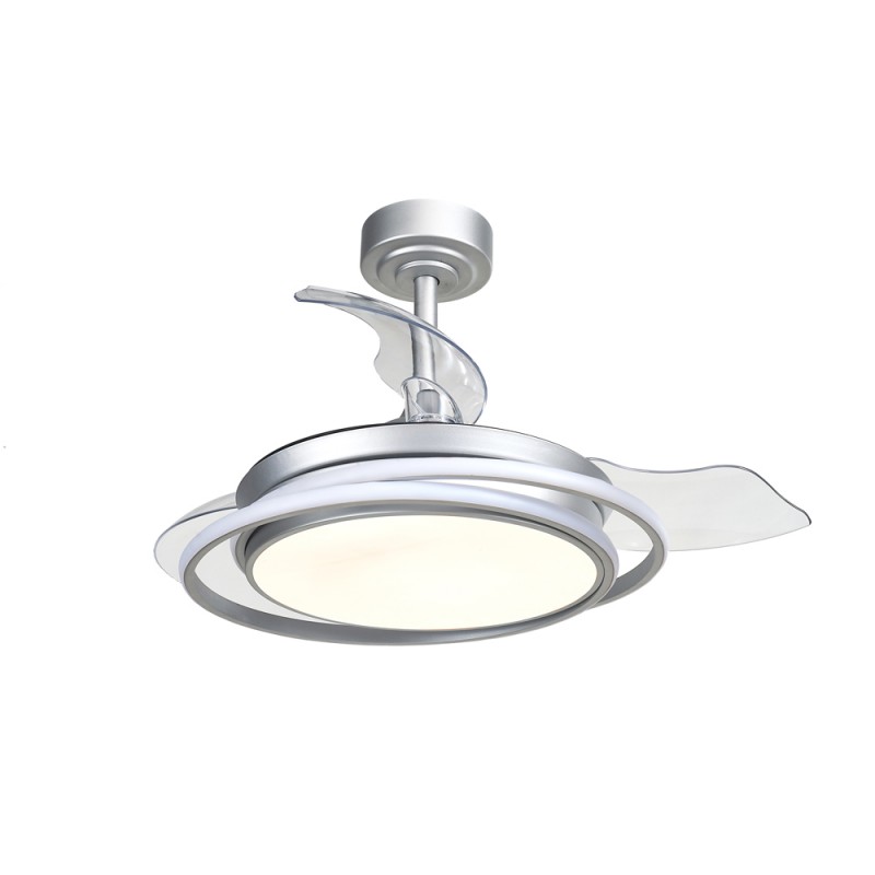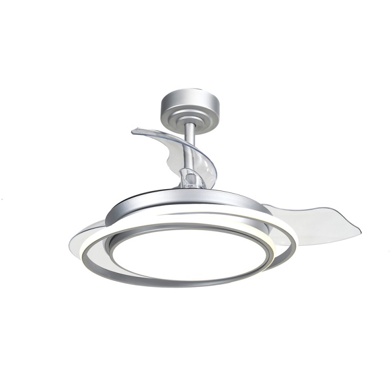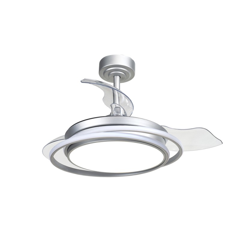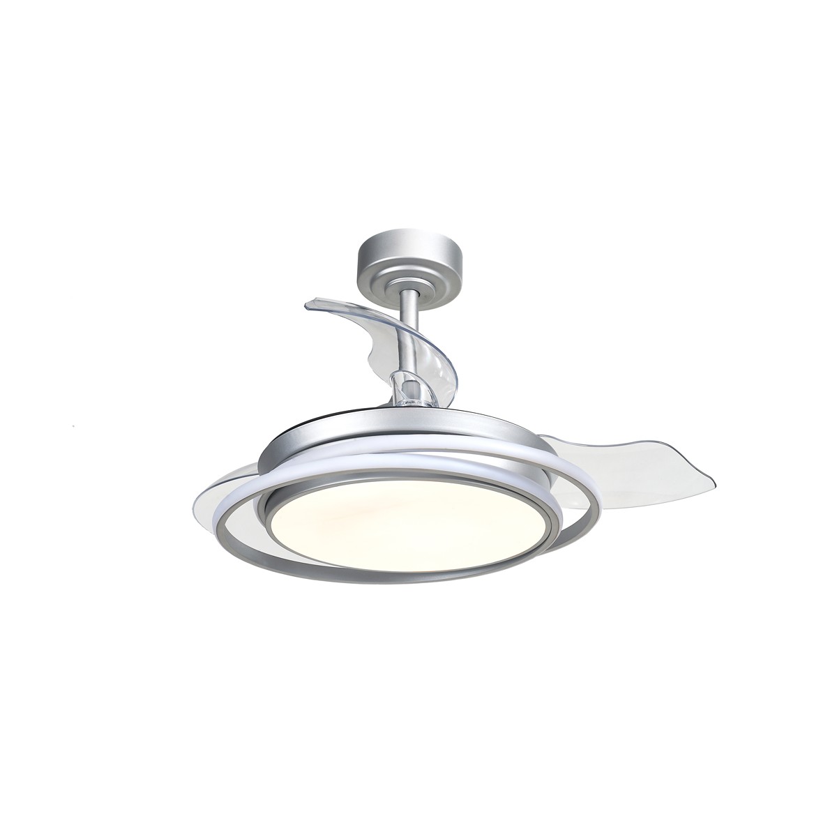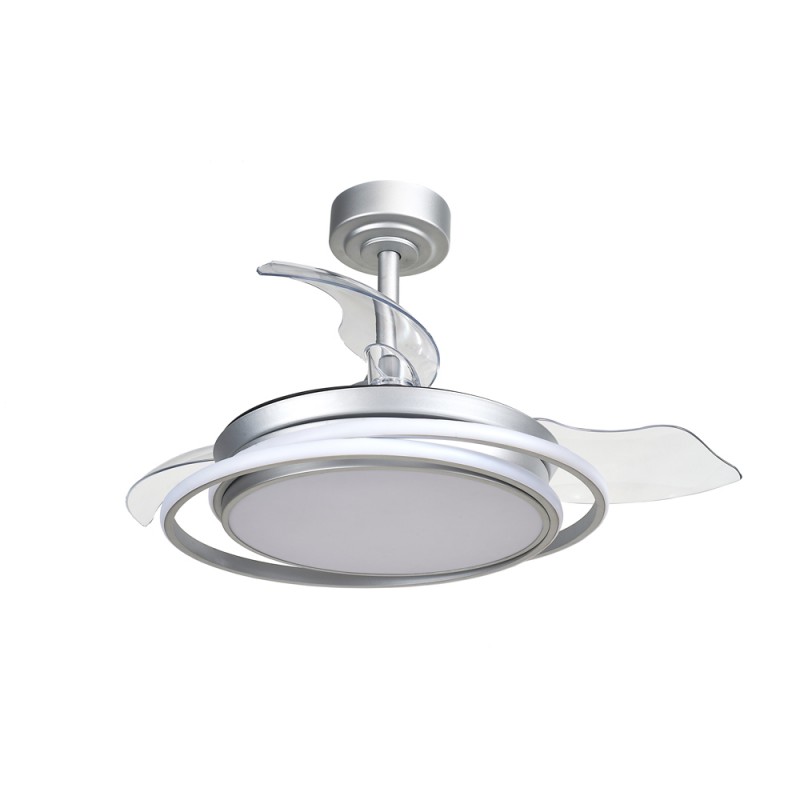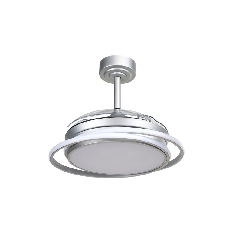 Ventilador de techo LED Antila Mini acabado plata. Ventilador con motor DC ultra silencioso de seis velocidades de giro, función inversa invierno verano y brisa. Su diseño con aspas retráctiles hace que cuando el ventilador no está en funcionamiento, estas queden recogidas encima del ventilador. Este tipo de ventiladores son muy prácticos para iluminar un dormitorio o un salón pequeño. Puedes controlar la luz de manera individual, encendiendo solo la luz principal, solo el aro decorativo o todo el ventilador a la vez según lo necesites. Iluminación LED regulable con tres tonos de temperatura de color.