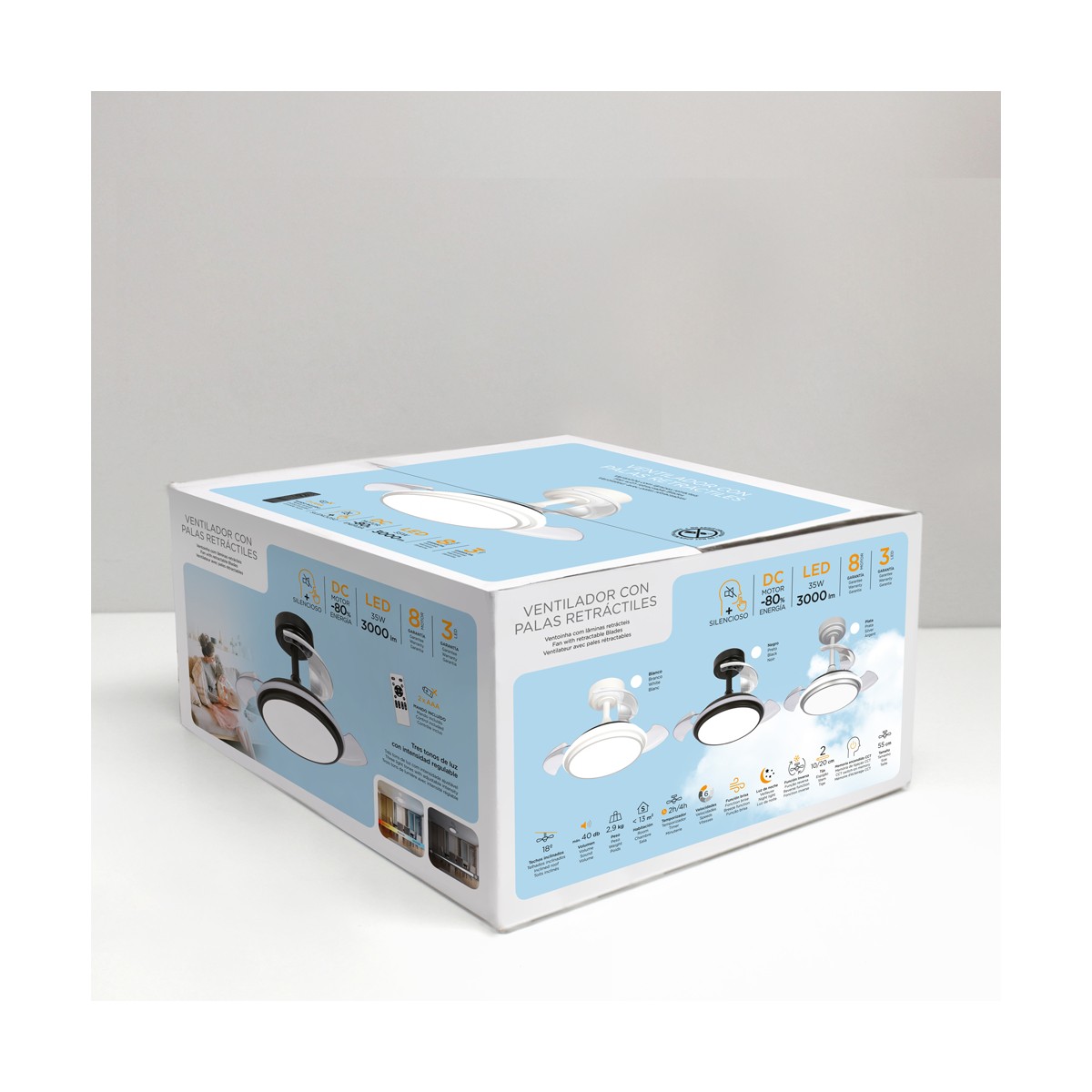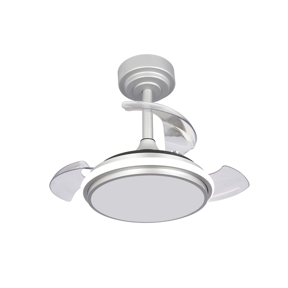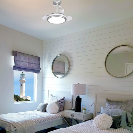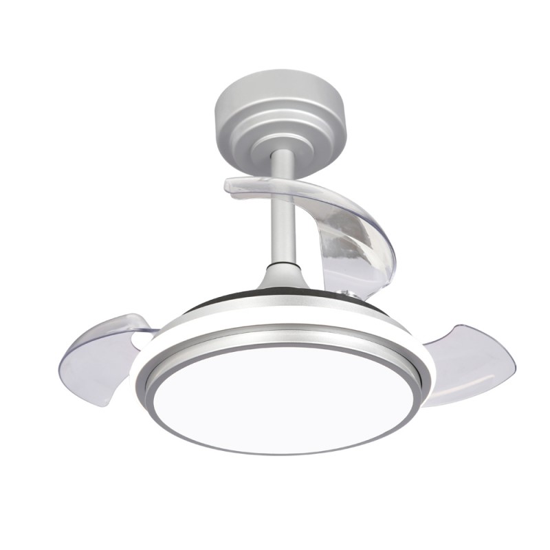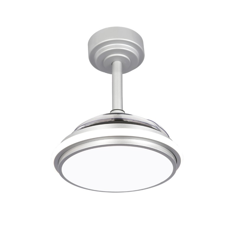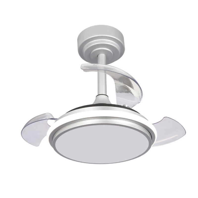 Ventilador de techo LED Antila Mini XS de color gris. Ventilador con motor DC ultra silencioso de seis velocidades de giro, función inversa invierno verano y brisa. Su diseño con aspas retráctiles hace que cuando el ventilador no está en funcionamiento, estas queden recogidas encima del ventilador. Este tipo de ventiladores son muy prácticos para iluminar un dormitorio pequeño al tener tamaño compacto y aspas plegables. Puedes encender solo la luz principal, solo el aro decorativo o todo el ventilador a la vez con el mando a distancia. Iluminación LED regulable con tres tonos de temperatura de color.
