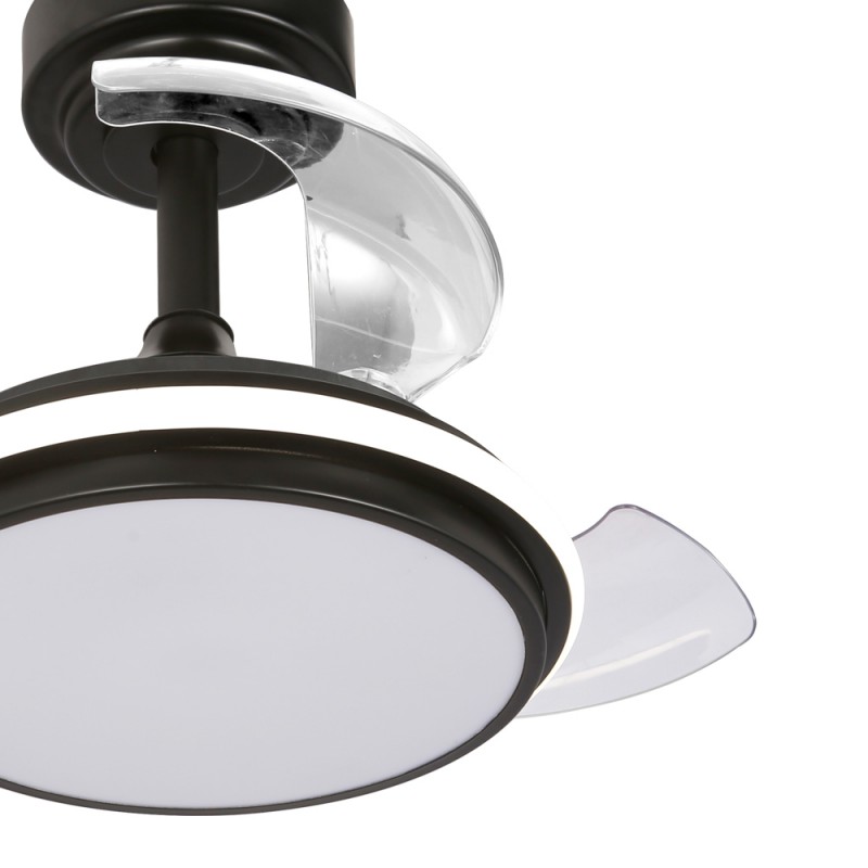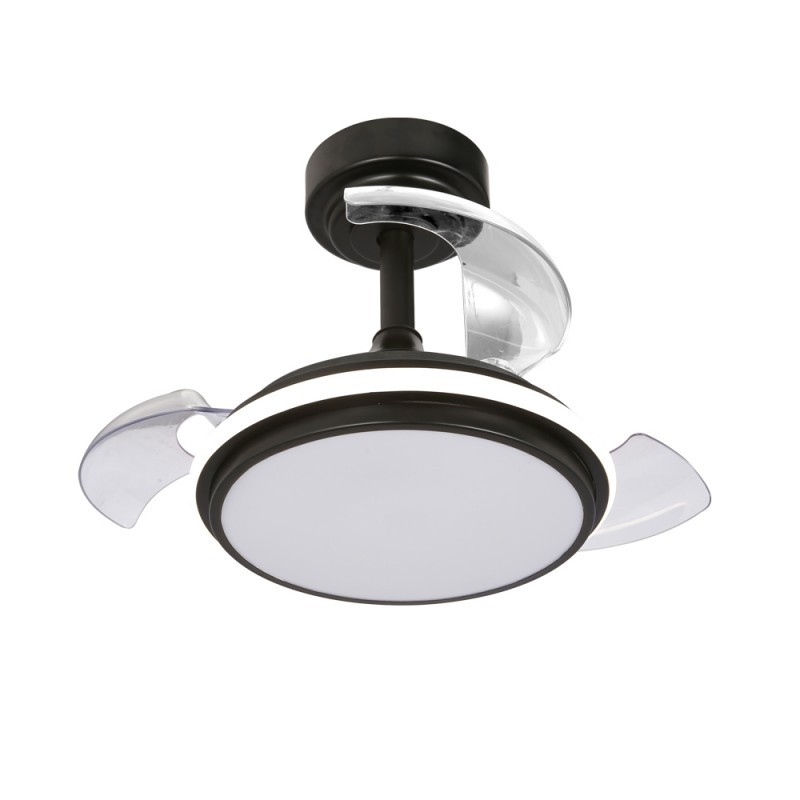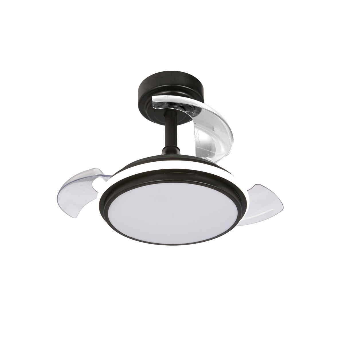 Ventilador de techo LED Antila Mini XS de color negro. Ventilador con motor DC ultra silencioso de seis velocidades de giro, función inversa invierno verano y brisa. Su diseño con aspas retráctiles hace que cuando el ventilador no está en funcionamiento, estas queden recogidas encima del ventilador. Este tipo de ventiladores son muy prácticos para iluminar un dormitorio pequeño al tener tamaño compacto y aspas plegables. Puedes encender solo la luz principal, solo el aro decorativo o todo el ventilador a la vez con el mando a distancia. Iluminación LED regulable con tres tonos de temperatura de color.