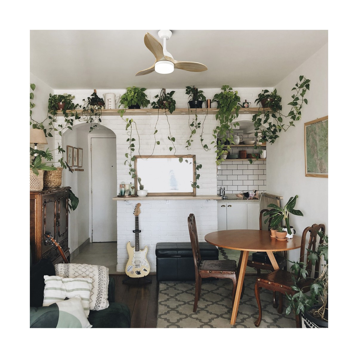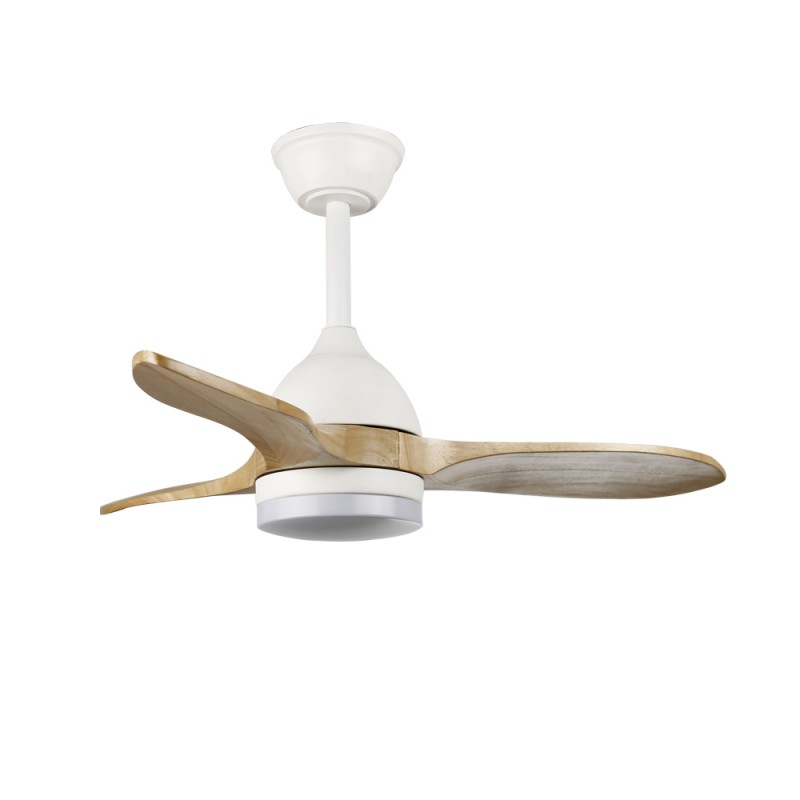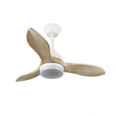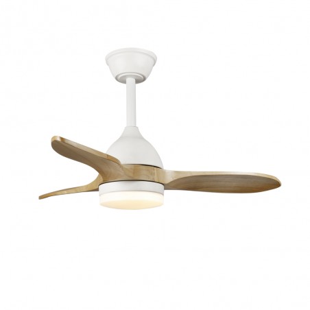 Ventilador de techo con aspas de madera natural. Ventilador lámpara LED pequeño diseñado para colocar en estancias <13 m3. El ventilador ofrece un estilo nórdico con el motor de acero blanco, tres aspas de madera natural certificada y un difusor de PMMA opal. Con el mando a distancia puedes regular la iluminación y controlar las 6 velocidades del ventilador.