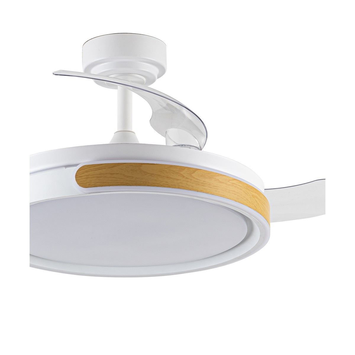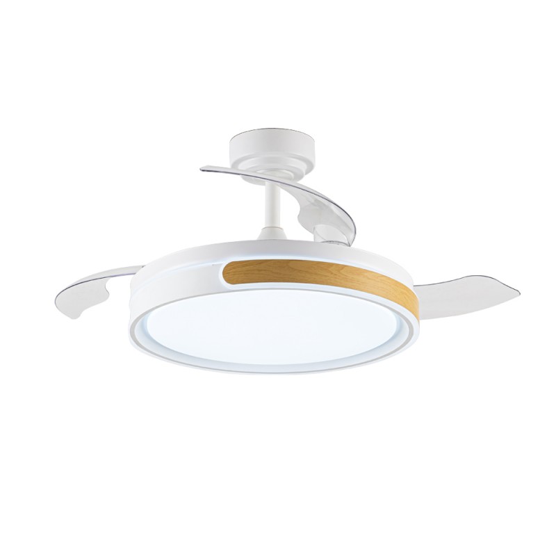 Ventilador de techo con aspas retráctiles Movic. Ventilador de estilo nórdico fabricado en acero de color blanco y con pieza de color madera a modo de decoración. Permite aportar flujo de aire a la vez que iluminación al contar con tecnología LED integrada. El motor es DC con seis velocidades de giro y emite el minimo de ruido cuando el ventilador está en funcionamiento. Con el mando a distancia puedes regular la iluminación y controlar el ventilador. Tres temperaturas de color, memoria de encendido, función inversa de giro y temporizador. Apto para techos inclinados (Max. 18º).