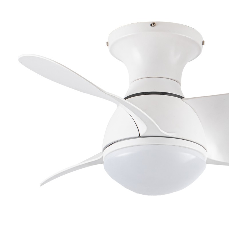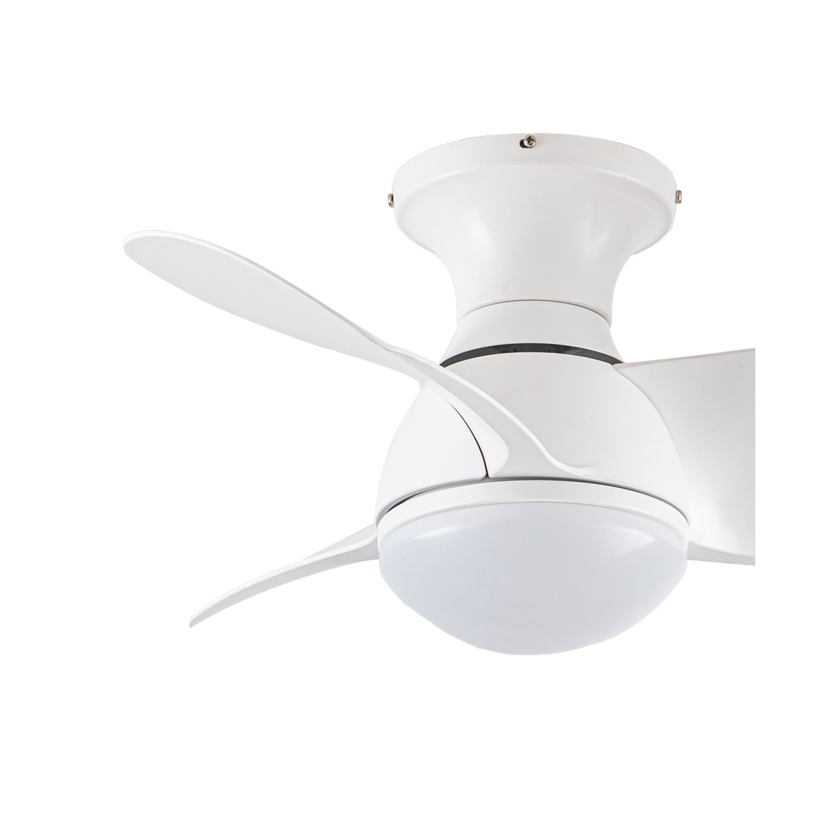 Ventilador de techo con luz LED para habitaciones pequeñas. Ventilador de techo de tamaño pequeño diseñado para dormitorios y estancias de menos de 13 metros cuadrados. Iluminación LED regulable en intensidad y en temperatura de color. El motor es DC por lo que emite muy poco ruido y tiene seis velocidades de giro. Ventilador silencioso de color blanco con tres aspas de ABS.