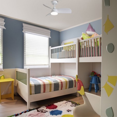 Ventilador de techo Byan para dormitorios y salones. Ventilador silencioso muy práctico para utilizar como fuente de luz y ventilación en dormitorios y estancias medianas. Motor DC de seis velocidades de giro, función inversa y temporizador para programar su apagado. Lleva integrada iluminación LED regulable en temperatura de color e intensidad de lúmenes. Color blanco.