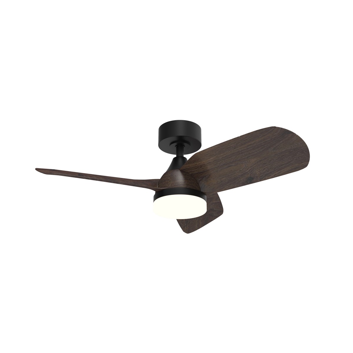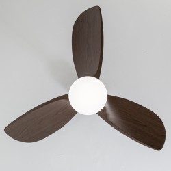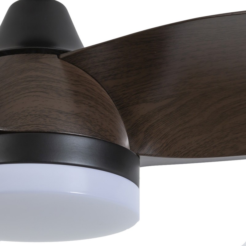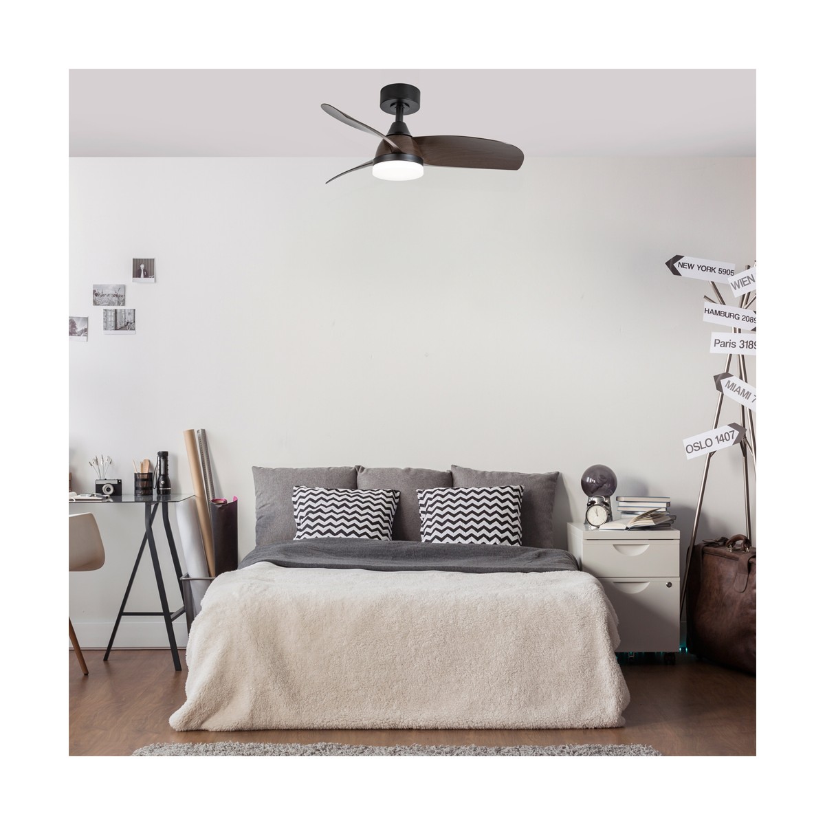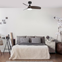 Ventilador de techo Byan para dormitorios y salones. Ventilador silencioso muy práctico para utilizar como fuente de luz y ventilación en dormitorios y estancias medianas. Motor DC de seis velocidades de giro, función inversa y temporizador para programar su apagado. Lleva integrada iluminación LED regulable en temperatura de color e intensidad de lúmenes. Color negro con aspas de ABS efecto madera oscura.