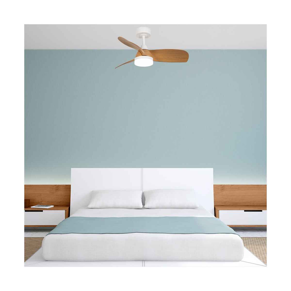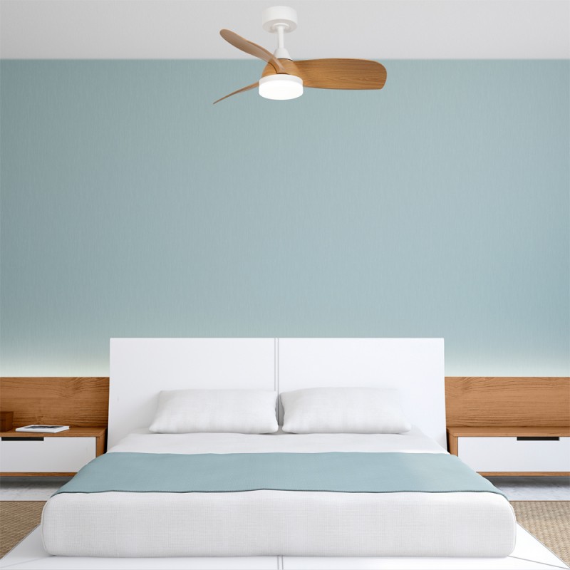Ventilador de techo Byan para dormitorios y salones. Ventilador silencioso muy práctico para utilizar como fuente de luz y ventilación en dormitorios y estancias medianas. Motor DC de seis velocidades de giro, función inversa y temporizador para programar su apagado. Lleva integrada iluminación LED regulable en temperatura de color e intensidad de lúmenes. Color blanco con aspas de ABS efecto madera clara.