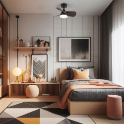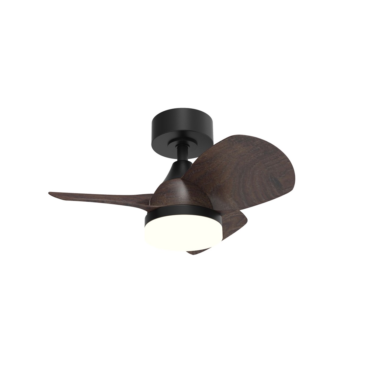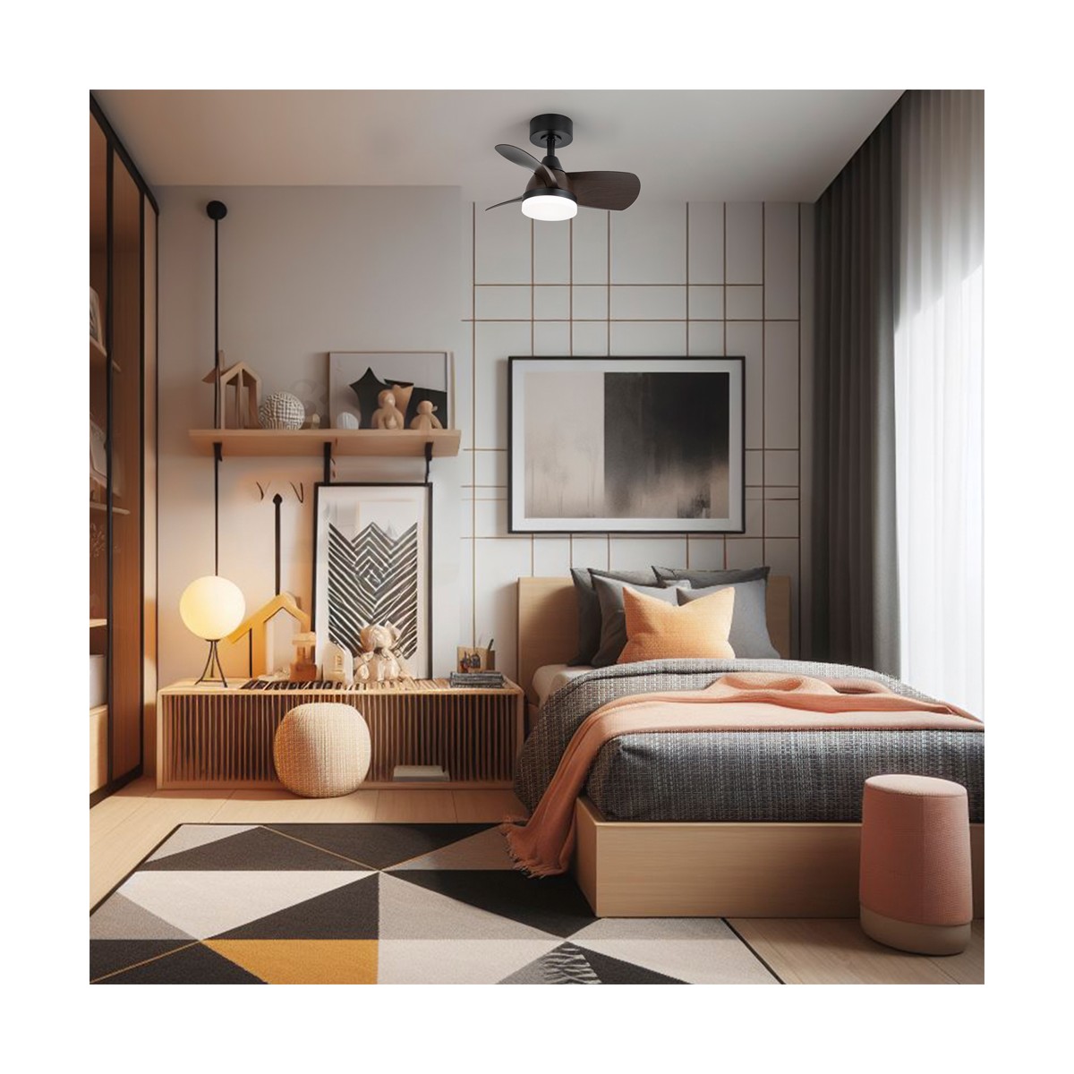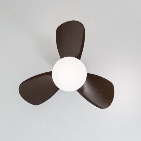 Ventilador de techo Byan Mini para dormitorios. Ventilador silencioso de tamaño pequeño muy práctico para dormitorios y estancias pequeñas. Motor DC de seis velocidades de giro, función inversa y temporizador para programar su apagado. Lleva integrada iluminación LED regulable en temperatura de color e intensidad de lúmenes. Color negro con aspas de ABS efecto madera oscura.