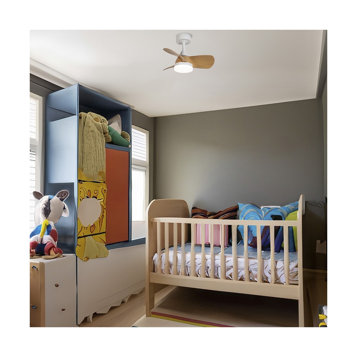 Ventilador de techo Byan Mini para dormitorios. Ventilador silencioso de tamaño pequeño muy práctico para dormitorios y estancias pequeñas. Motor DC de seis velocidades de giro, función inversa y temporizador para programar su apagado. Lleva integrada iluminación LED regulable en temperatura de color e intensidad de lúmenes. Color blanco con aspas de ABS efecto madera clara.