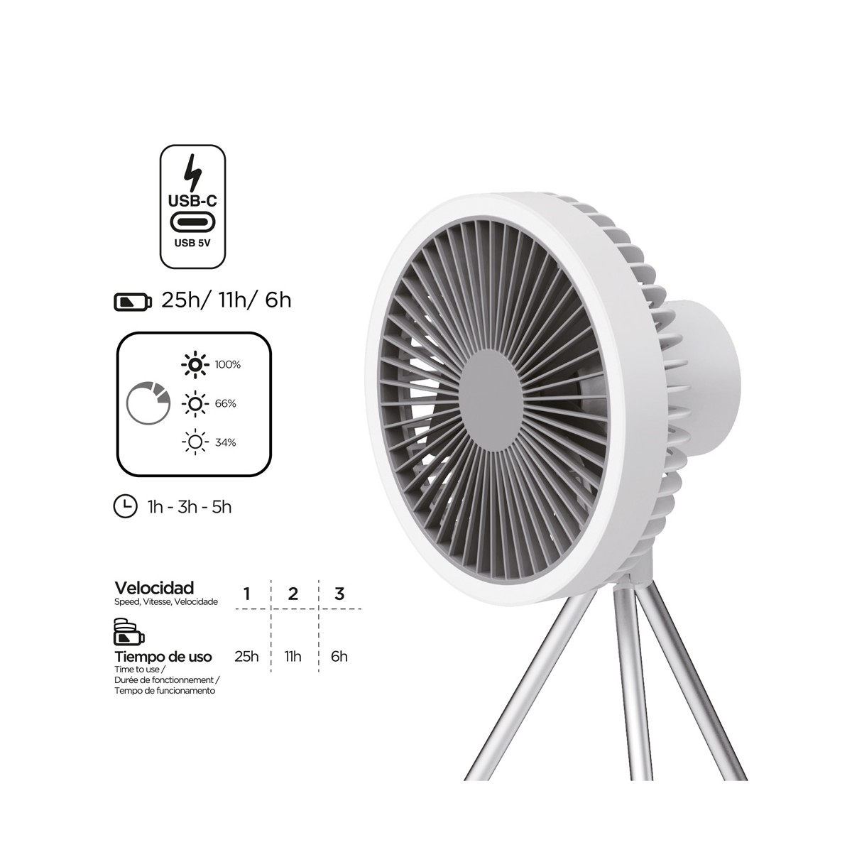 Ventilador portátil con batería recargable. Práctico ventilador para utilizar en cualquier estancia de casa, en el jardín o en la terraza. Cuenta con batería recargable con puerto USB-C lo que permite utilizarlo sin necesidad de cables. Puedes colocarlo en una superficie como la mesa o el suelo con la estructura de trípode, colgarlo en la pared o el techo con un gancho. Cuenta con tres intensidades de luz (50%-100%) y un modo luz de noche.