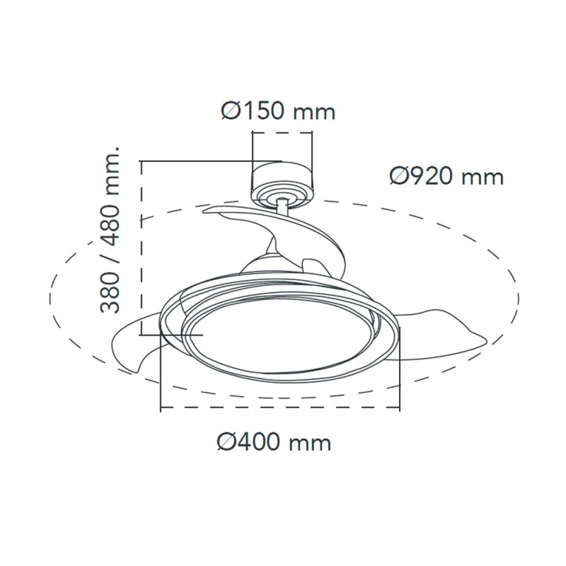 Ventilador de techo LED Antila Mini de color blanco. Ventilador con motor DC ultra silencioso de seis velocidades de giro, función inversa invierno verano y brisa. Su diseño con aspas retráctiles hace que cuando el ventilador no está en funcionamiento, estas queden recogidas encima del ventilador. Puedes encender solo la luz principal, solo el aro decorativo o todo el ventilador a la vez con el mando a distancia