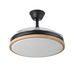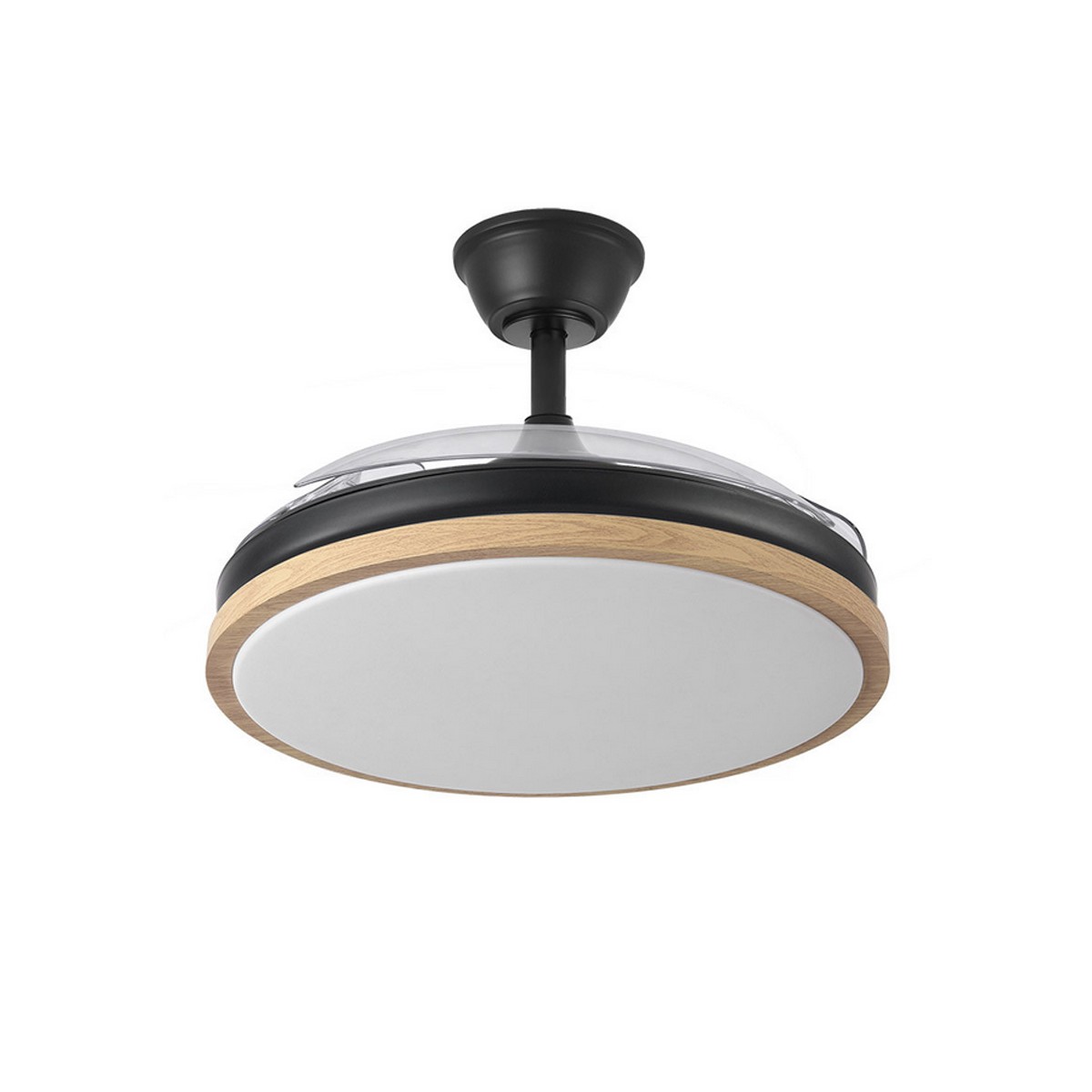 Ventilador de techo LED Panam con aspas retráctiles. Ventilador nórdico de color negro con un práctico diseño que permite tanto aportar ventilación como iluminar la estancia. Lleva integrada iluminación LED dimmable en intensidad de lúmenes y tres temperaturas de color (3000-4000-6000K). Además, con el mando a distancia puedes seleccionar función brisa, un modo luz de noche o fijar el apagado del ventilador a las 2-4 horas. Motor DC ultrasilencioso con seis velocidades de giro y función inversa invierno verano. Ventilador de color negro con decoración efecto madera. Aspas retráctiles transparentes.