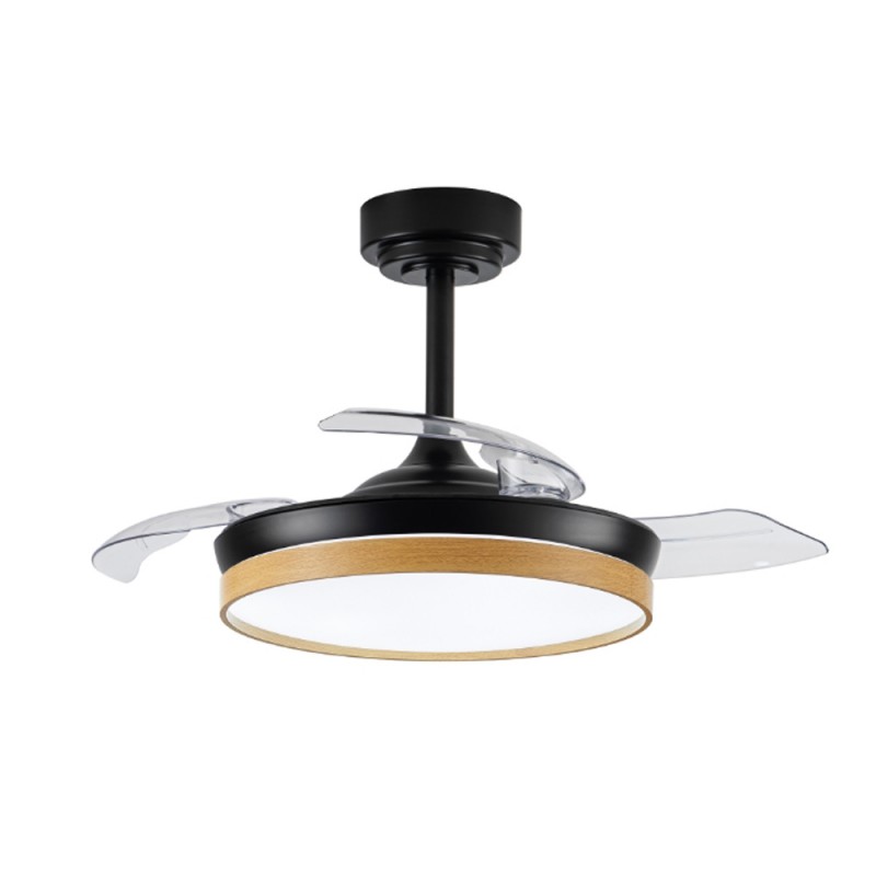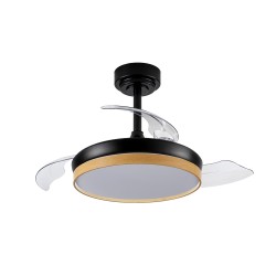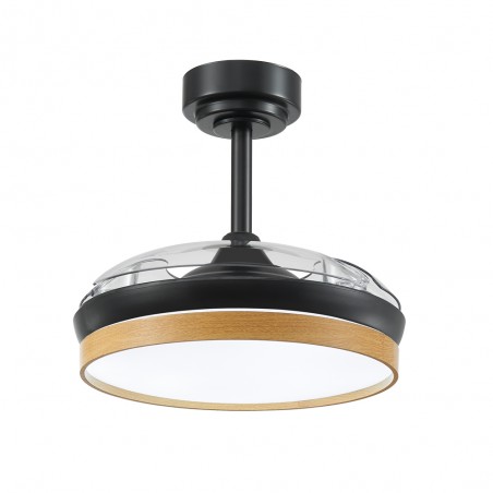 Ventilador de techo LED Panam Mini para estancias pequeñas. Ventilador de techo con aspas retráctiles diseñado para aportar flujo de aire e iluminación en dormitorios y salones pequeños. Cuenta con un motor ultrasilencioso de 6 velocidades de giro, función inversa invierno-verano, temporizador y función brisa. En cuanto a la iluminación, puedes establecer tres tonos de iluminación (cálida, neutra o fría) y dimar la intensidad de lúmenes. Ventilador de color negro con decoración efecto madera clara. Aspas retráctiles transparentes.