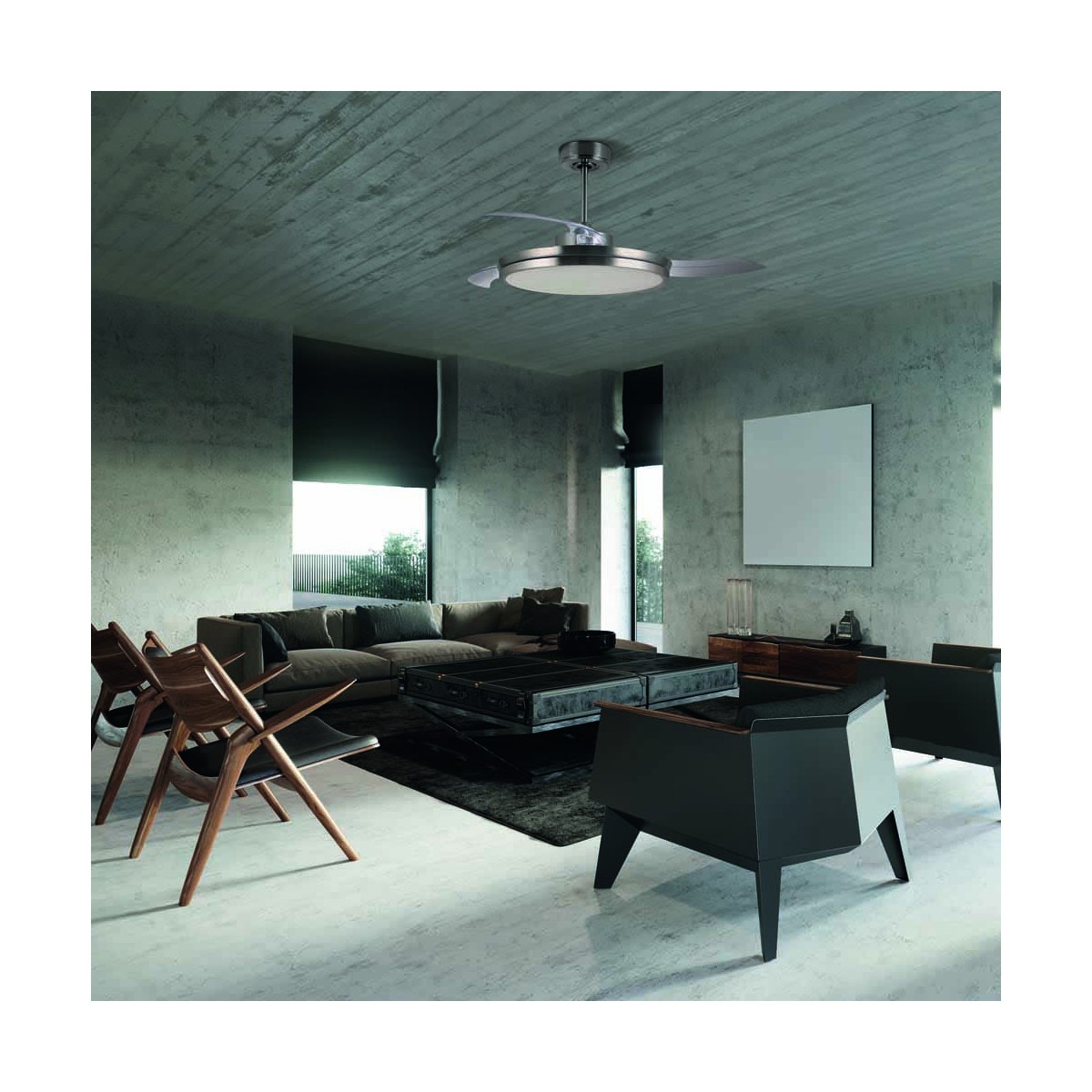 Ventilador de techo de palas plegables transparentes con motor DC. Gracias a su motor permite reducir el consumo consiguiendo hasta 6 velocidades generando muy poco ruido. Este ventilador tiene iluminación led integrada de 48W con tres tonos de luz. Además cuenta con la función brisa, que cambia de una velocidad a otra de manera automática creando un ambiente con aire natural.