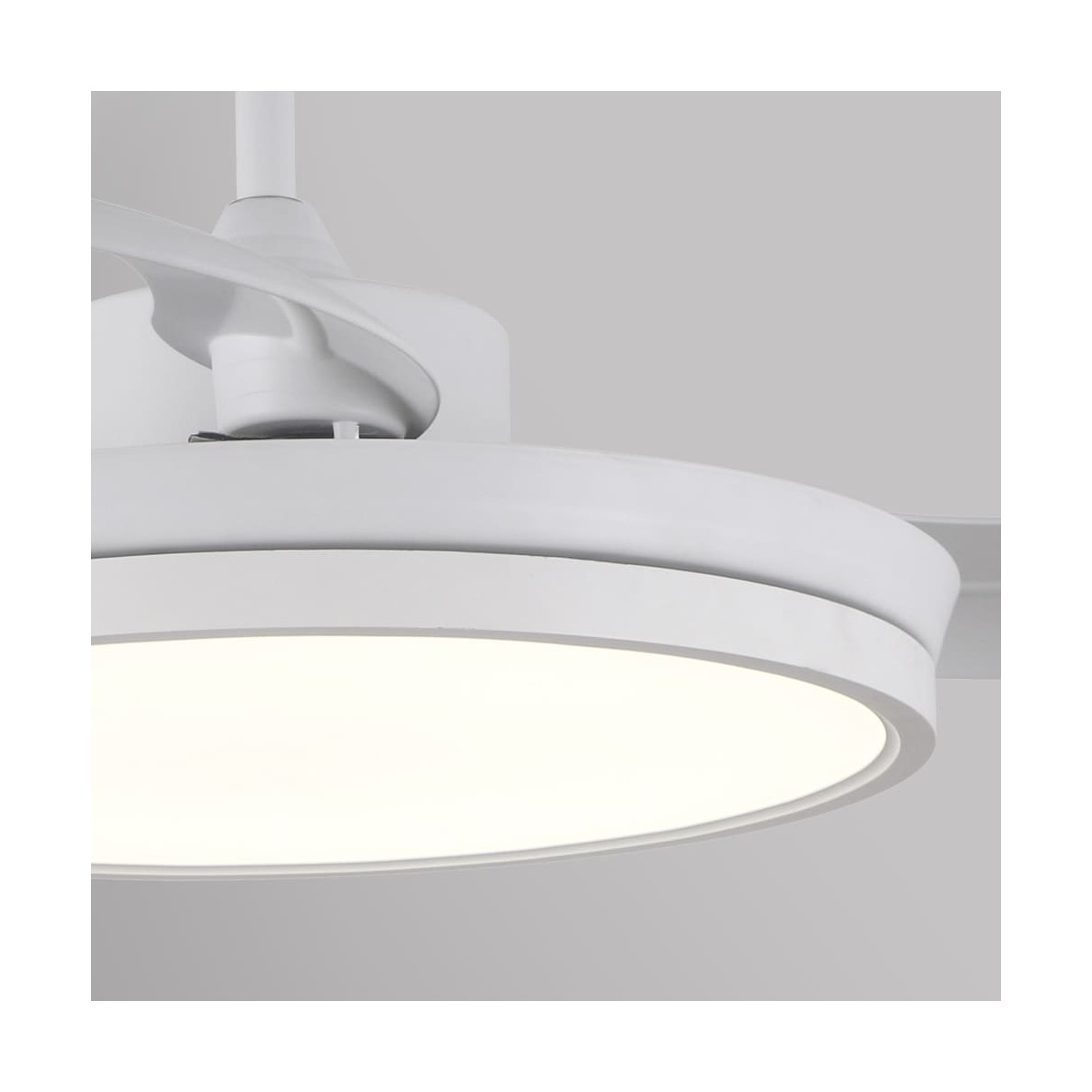 Ventilador de techo de palas plegables blancas con motor DC. Gracias a su motor permite reducir el consumo consiguiendo hasta 6 velocidades generando muy poco ruido. Este ventilador tiene iluminación led integrada de 48W con tres tonos de luz. Además cuenta con la función brisa, que cambia de una velocidad a otra de manera automática creando un ambiente con aire natural. La función ventilar de este ventilador hace funcionar durante 15 minutos de cada hora el ventilador a una velocidad media para renovar el aire.