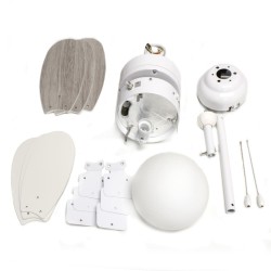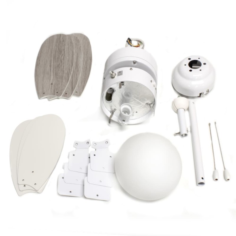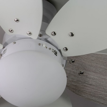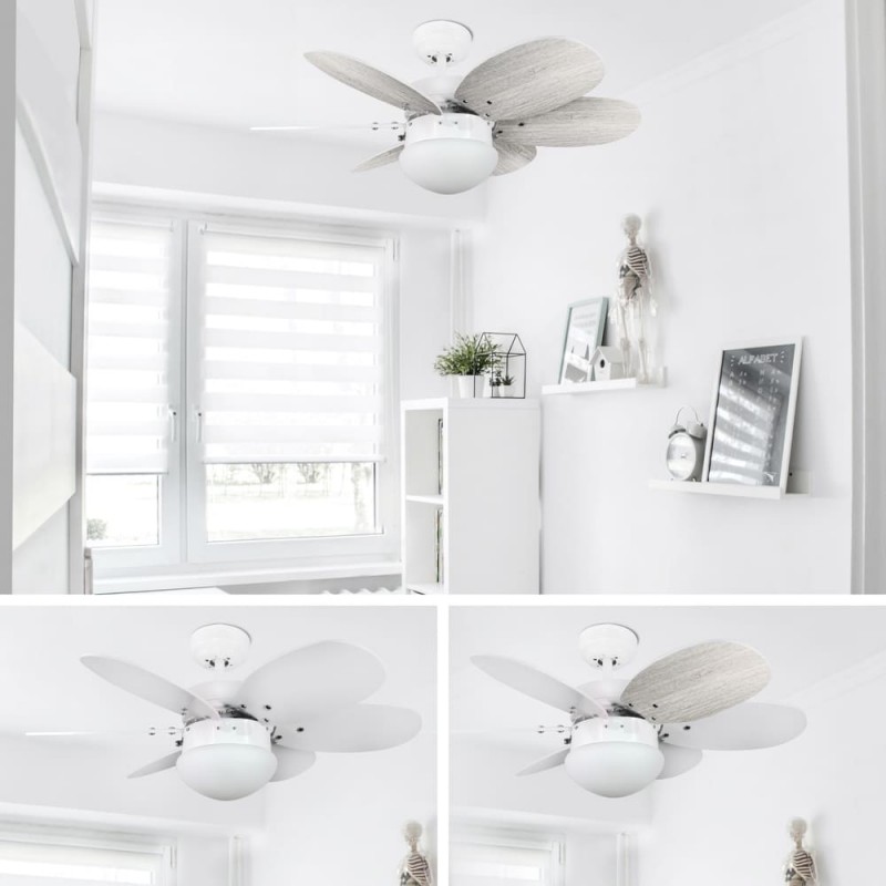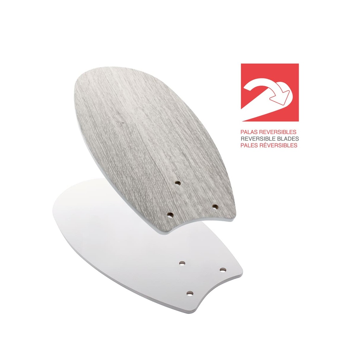 Ventilador de techo de la colección Orion con 6 aspas reversibles, fabricado en madera contrachapada, en colores blanco o ceniza a elegir. Ventilador de techo económico que dispone de 3 velocidades de flujo de aire, y kit de iluminación, que funciona con bombilla E27, no incluida. El sistema de funcionamiento verano-invierno le ayudará a disfrutar de él en toda la temporada. El ventilador se enciende con dos cuerdas suspendidas. También puede conectarlo al interruptor de la pared, o adquirir por separado un mando a distancia con la ref. MD VENTI UNIVERSAL.