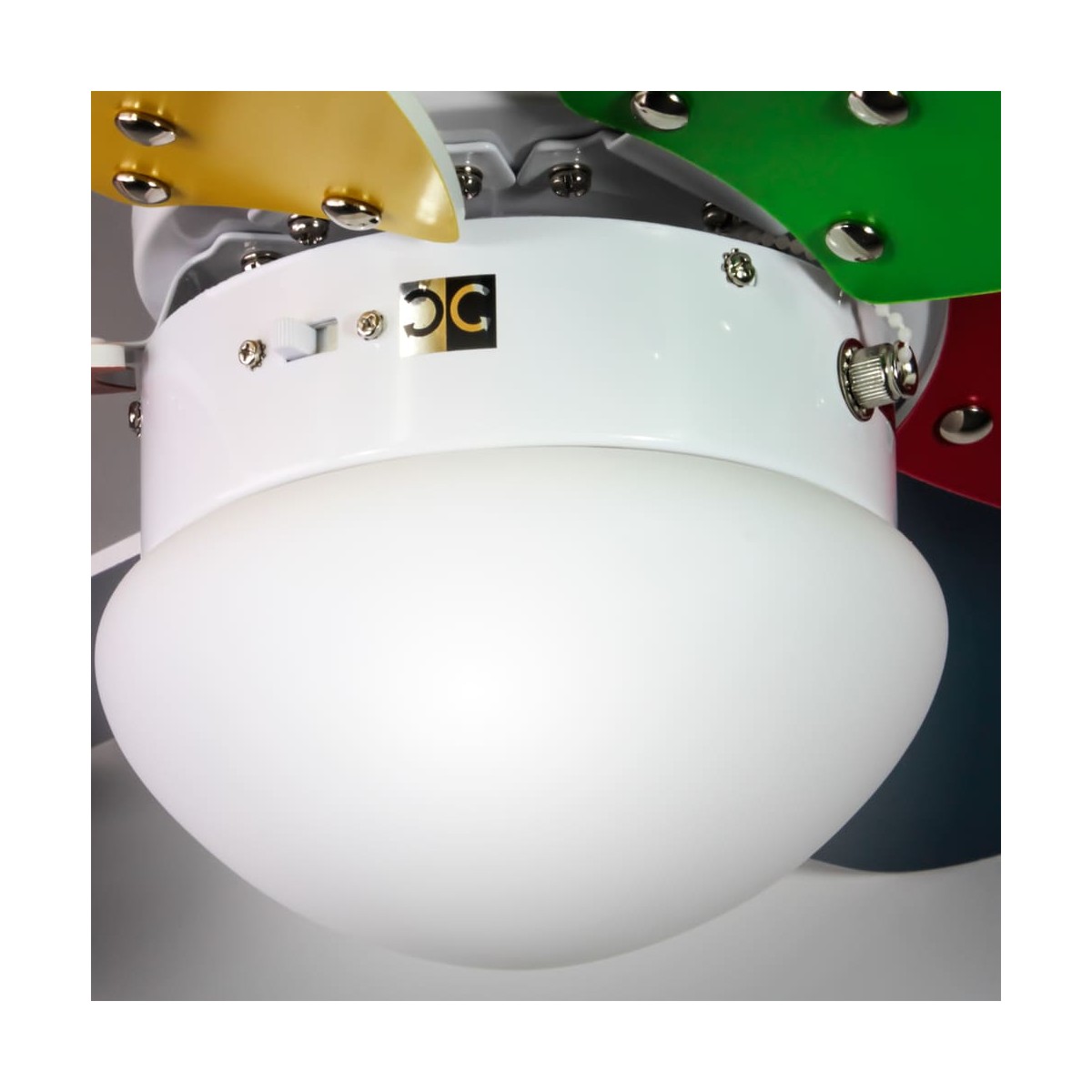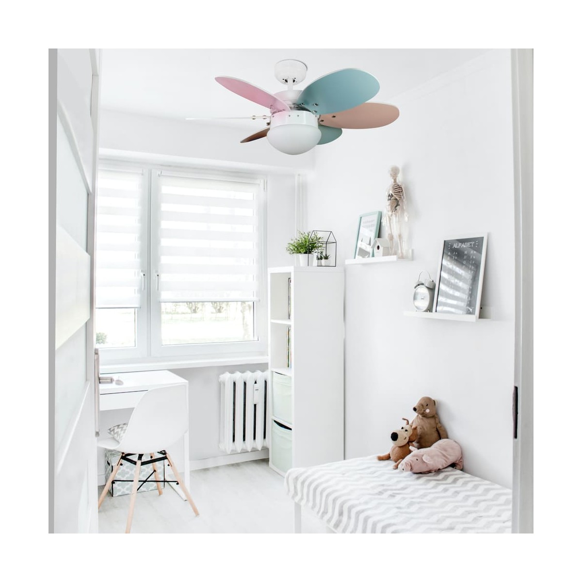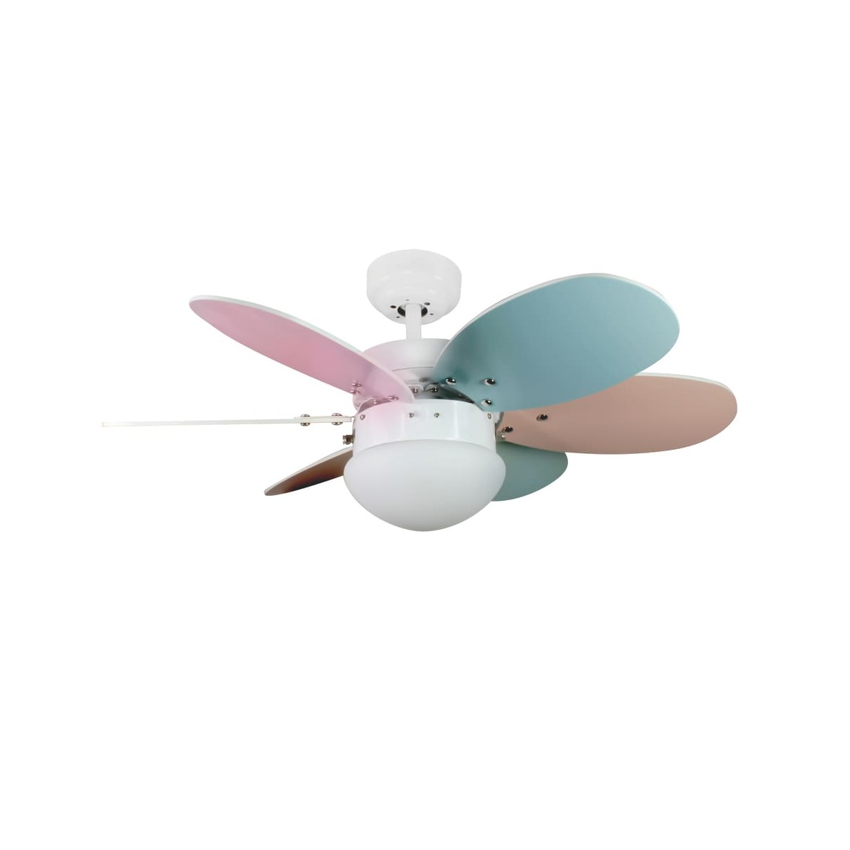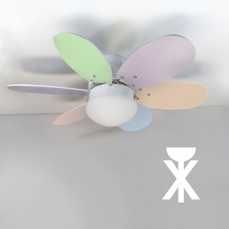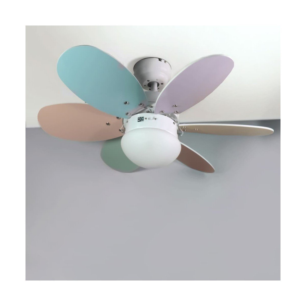 Ventilador de techo de la Colección Orion con 6 aspas reversibles, fabricado en madera contrachapada, en 6 colores pastel o multicolor. Ventilador de techo económico que dispone de 3 velocidades. Kit de iluminación con bombilla E27, no incluida. La función verano-invierno le ayudará a disfrutar de él durante todo el año. El ventilador se enciende con las dos cadenas del motor aunque puedes instalarlo junto con un kit de mando universal.
