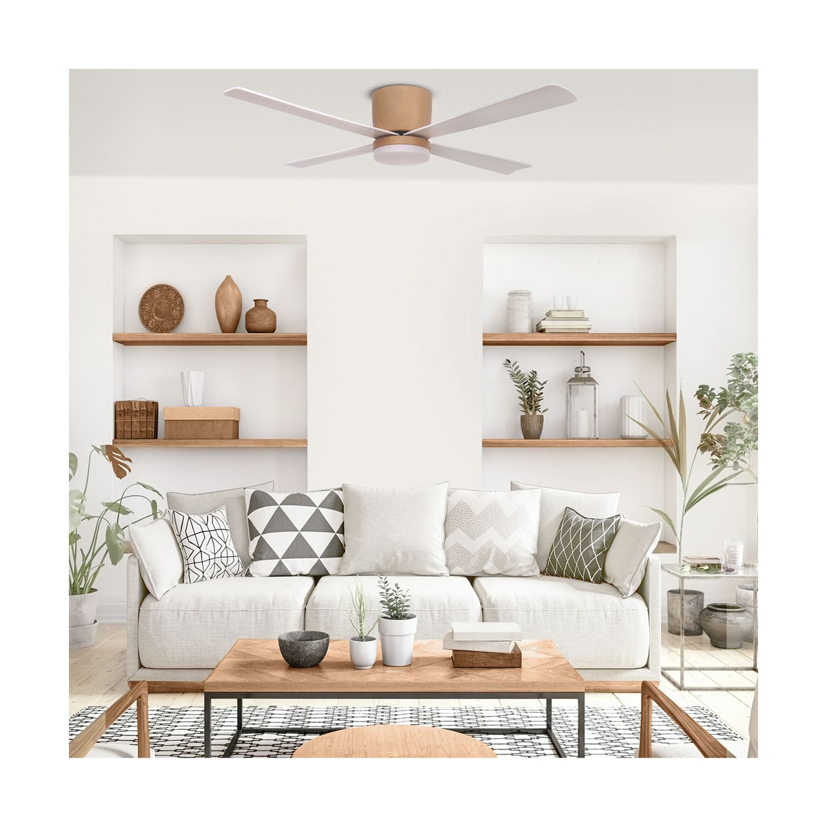 Ventilador de techo con motor DC de bajo consumo con 5 velocidades. Montaje directo a techo. Iluminación led integrada de 15W con tres tonos de luz y función memoria para recuperar el último encendido. Desde el mando puedes controlar el tiempo de funcionamiento, configurando el temporizador en 1-2-4-8 horas para programar su apagado. Incluye función verano invierno para por utilizar durante todo el año.