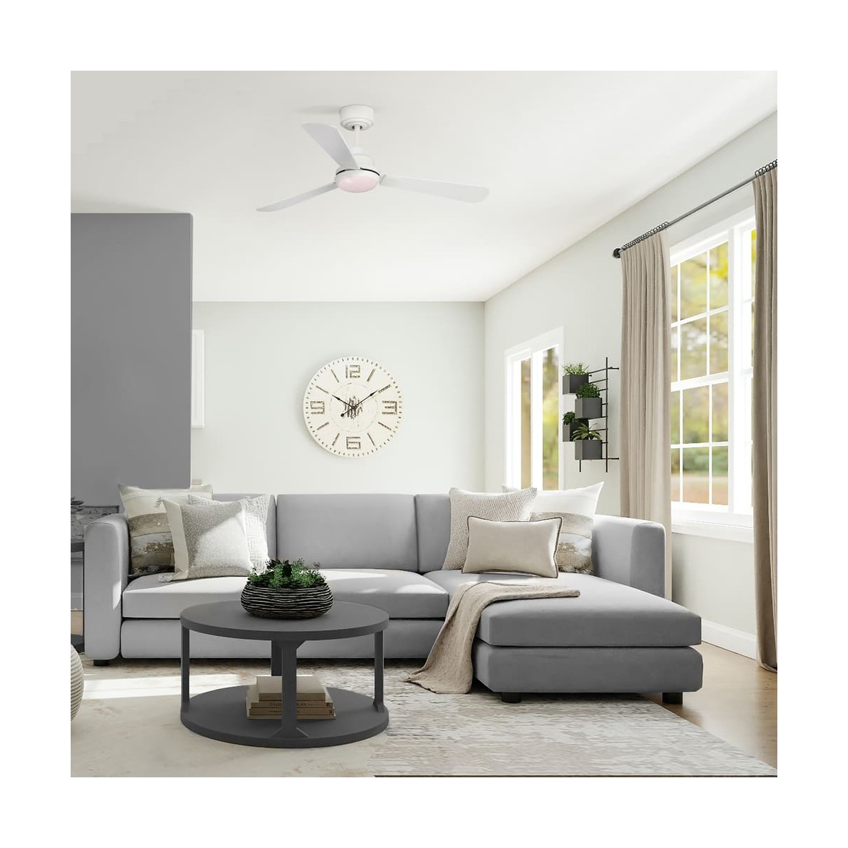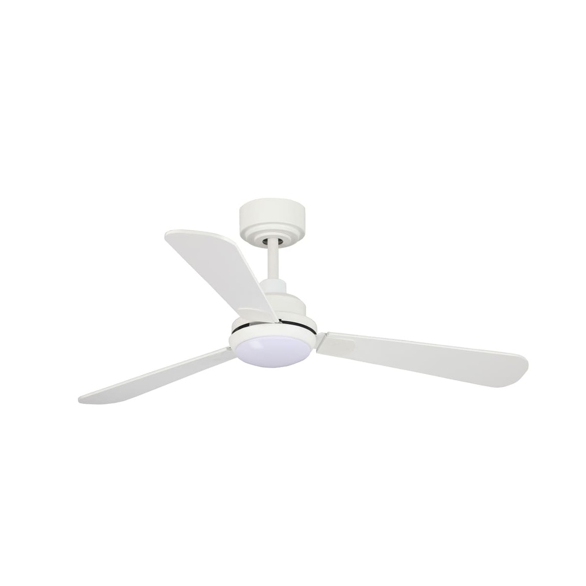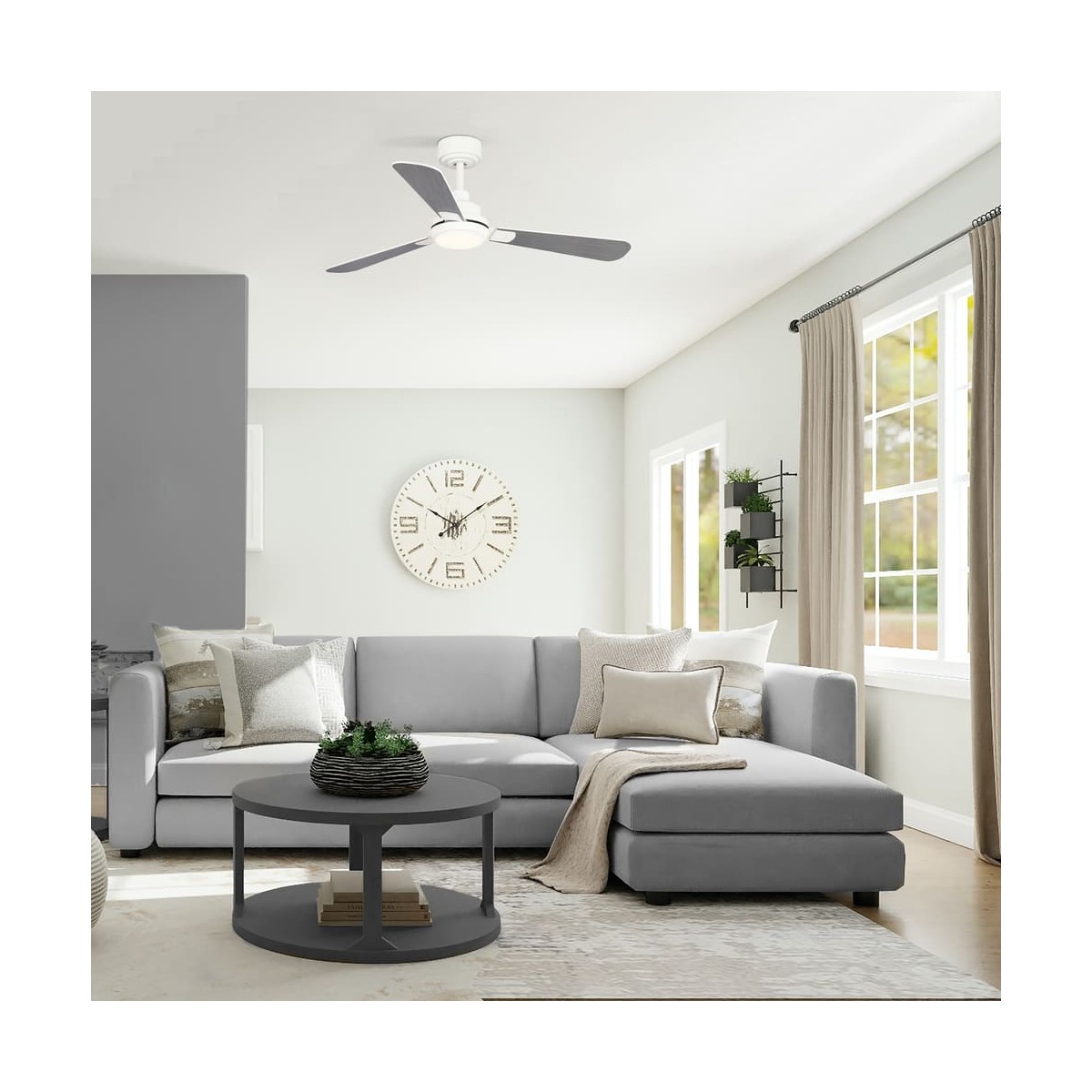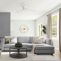 Ventilador con motor DC de 5 velocidades. Su principal ventaja decorativa, cuenta con unas palas reversibles, que te permiten elegir entre un tono ceniza o blanco. También puedes regular su altura, ya que incorpora dos tizas. Permite la instalación en techos inclinados de hasta 15º.
