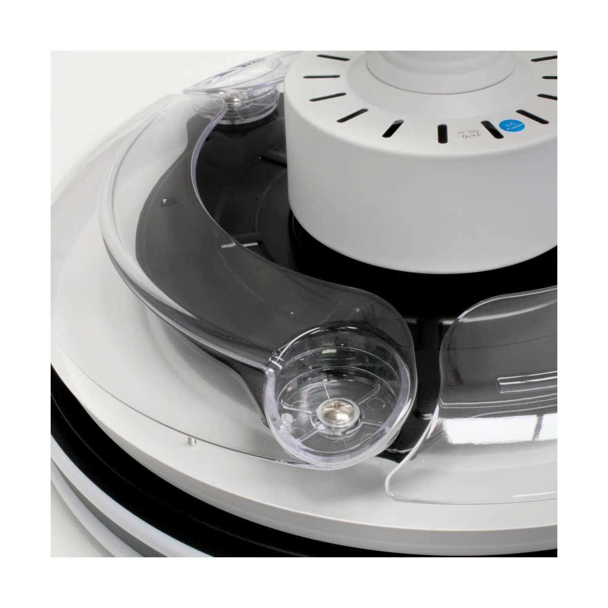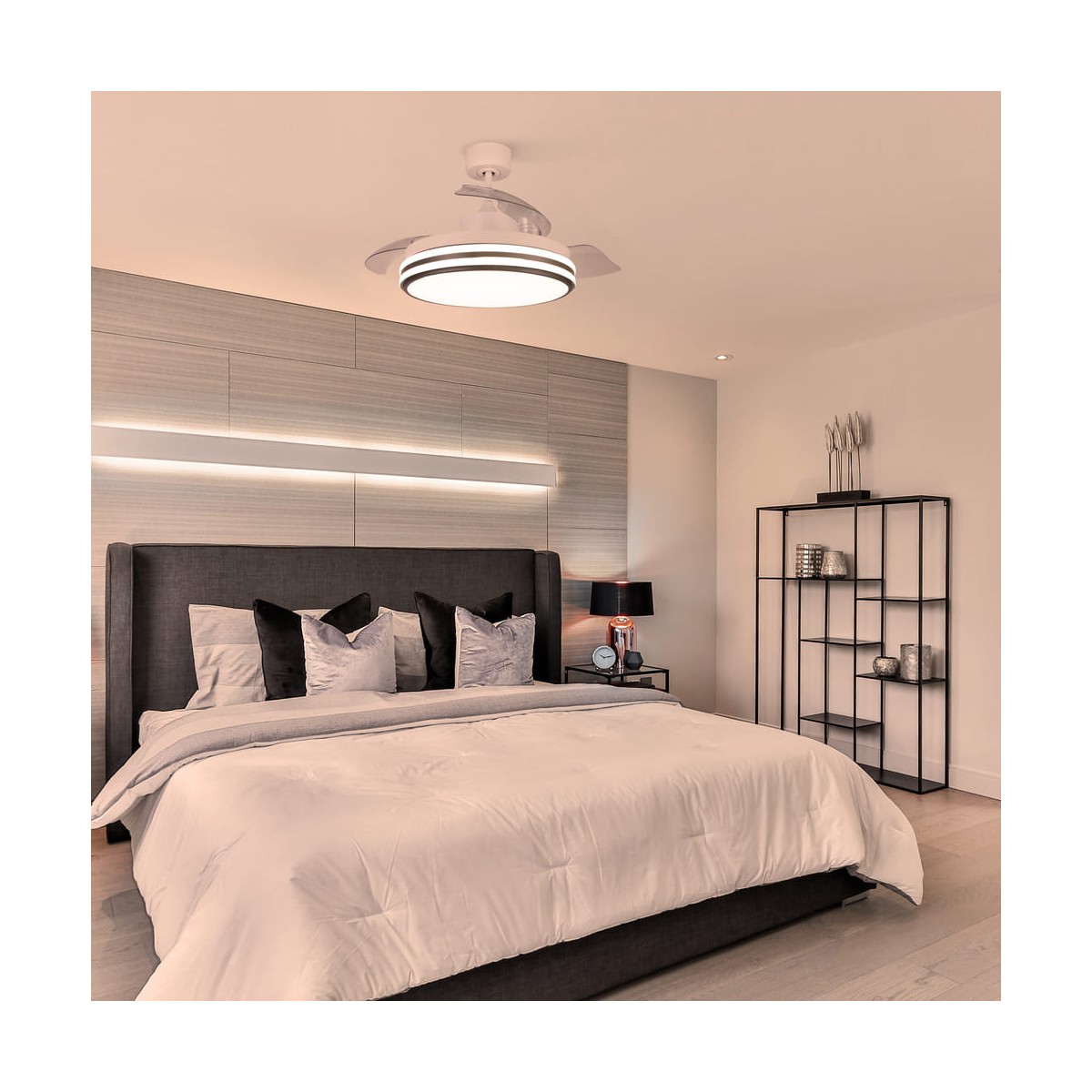 Ventilador de techo de palas plegables transparentes con motor DC. Gracias a su motor permite reducir el consumo consiguiendo hasta 6 velocidades generando muy poco ruido. Este ventilador tiene iluminación led integrada de 35W con tres tonos de luz. Además cuenta con la función brisa, que cambia de una velocidad a otra de manera automática creando un ambiente con aire natural.