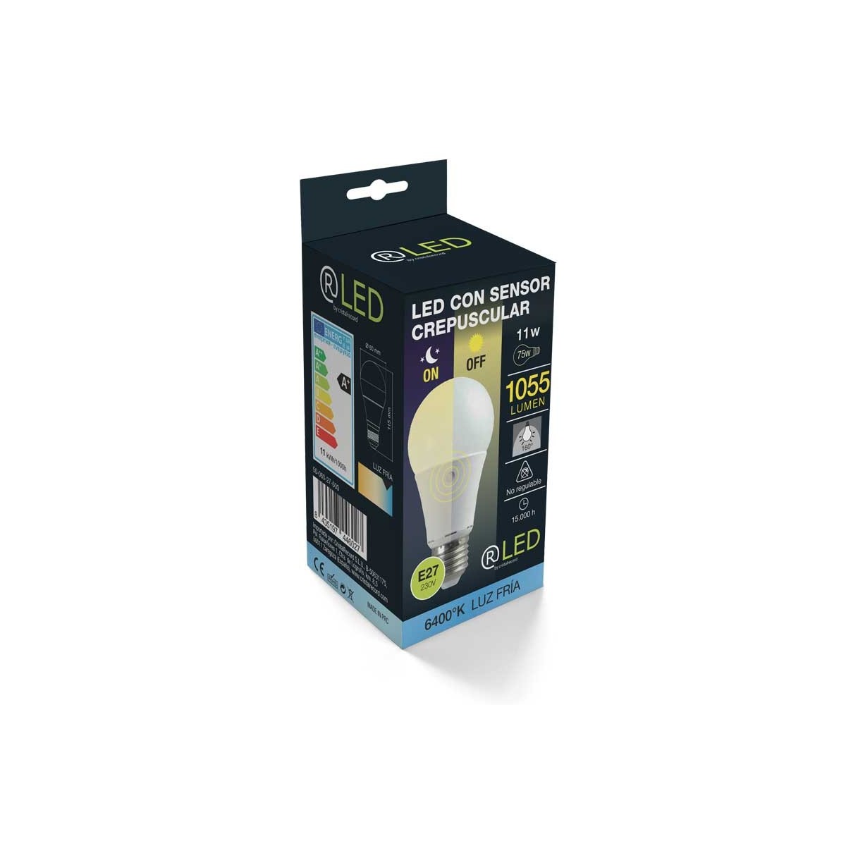 Bombilla LED A60 con sensor crepuscular integradoy luz neutra 4000K. Se apaga con la luz del sol y se enciende por la noche.