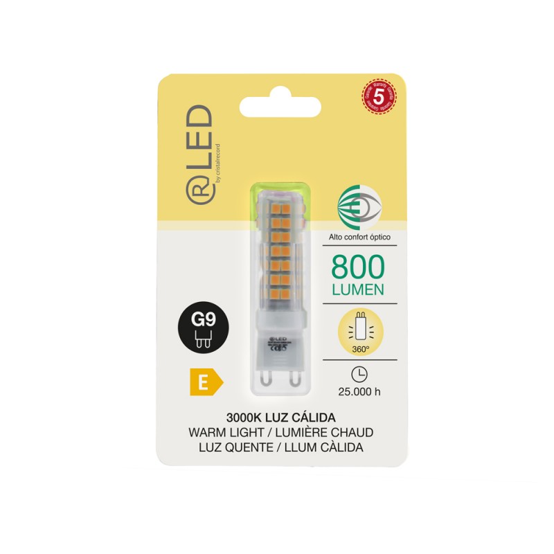 Bombilla LED G9 con temperatura de color 3000K. Bombilla G9 con 6.5 cm. de alto y 1.8 cm. de diámetro. Alto confort visual, vida útil de 25.000h y haz de luz de 360º. Bombilla rosca G9 con 6W, 800 lúmenes y tempera de color blanca cálida (3000K).