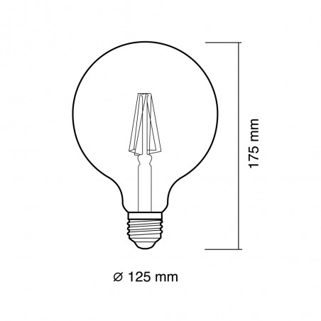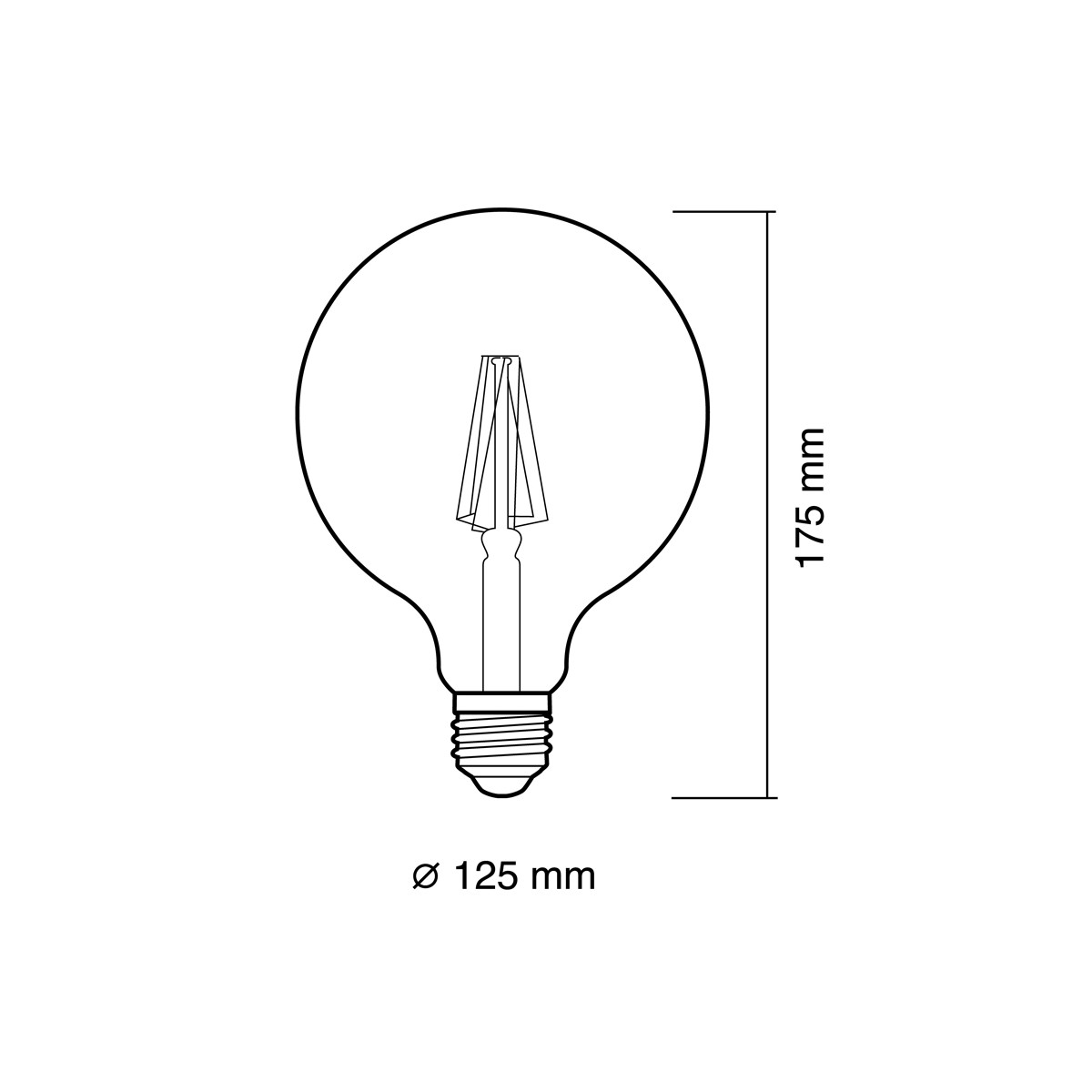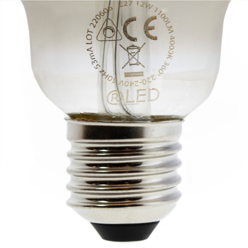 Bombilla decorativa fumé de filamentos. Bombilla rosca E27 y forma de globo G125 hecha de cristal fumé. Iluminación LED de 12W, 1100 lúmenes de intensidad y tono de color blanco neutro (4000K).