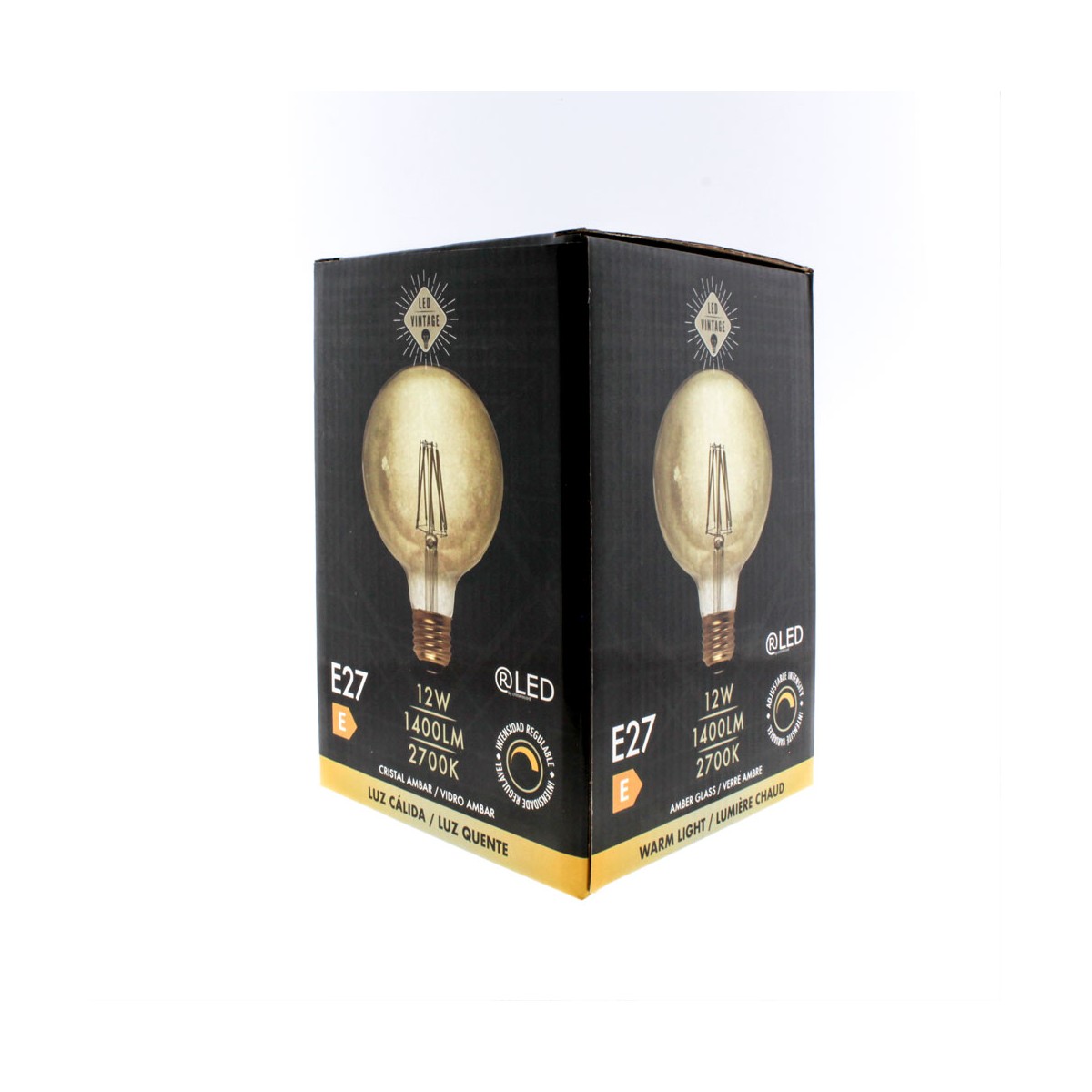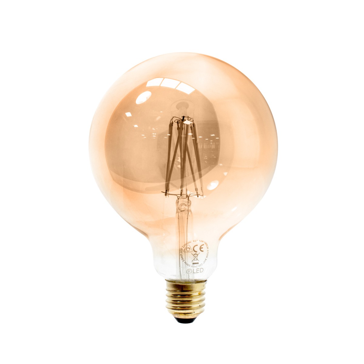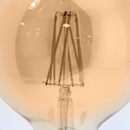 Bombilla decorativa de filamentos en forma de globo G125. Bombilla de cristal oro con filamentos ideal como iluminación decorativa. LED de 12W, 1400 lúmenes y temperatura de color cálida (2700K). Intensidad de luz dimmable.