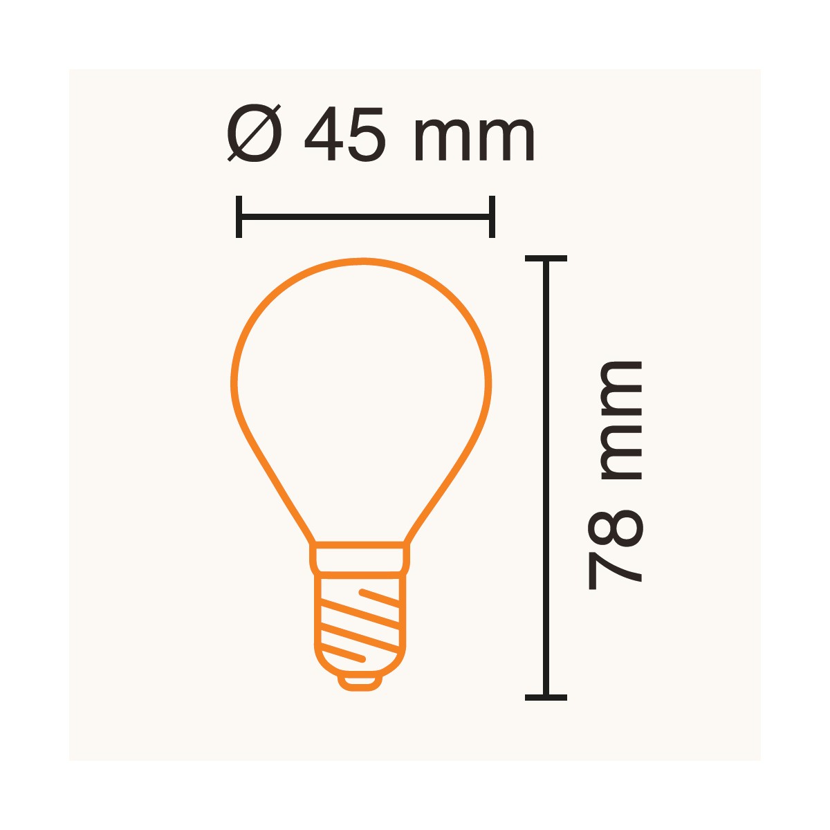 Bombilla LED E14 G45. Bombilla clase A de tamaño pequeño ideal G45 ideal para iluminación interior. LED de 4W, 840 lúmenes y temperatura de color 6000K (blanca fría). Bombilla pequeña de globo rosca E14, vida útil de 35.000 horas y encendido en 0.5 segundos. Eficiencia energética: A.