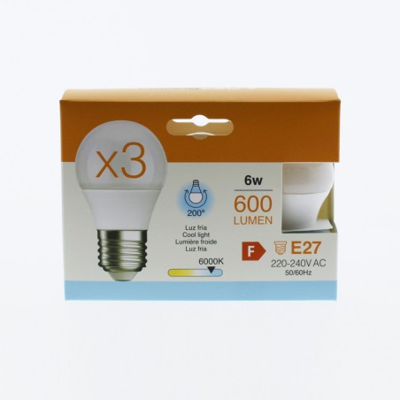 Pack de 3 bombillas rosca E27 G45. LED 6W, 600 lúmenes y 6000K (luz blanca fría). Haz de luz de 200º, clase energética F y vida útil de 35.000 horas. Pack compuesto por tres bombillas E27 LED.