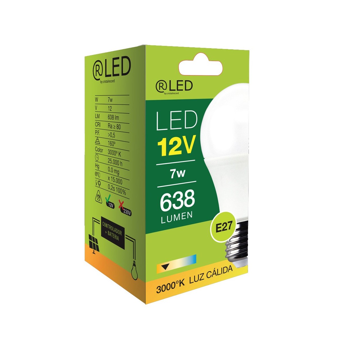 Bombilla LED de bajo voltaje 12V con rosca E27. Bombilla LED standar de 7W con 638 lumenes. Bombilla de baja tensión perfecta para instalar junto con baterias o placas solares.