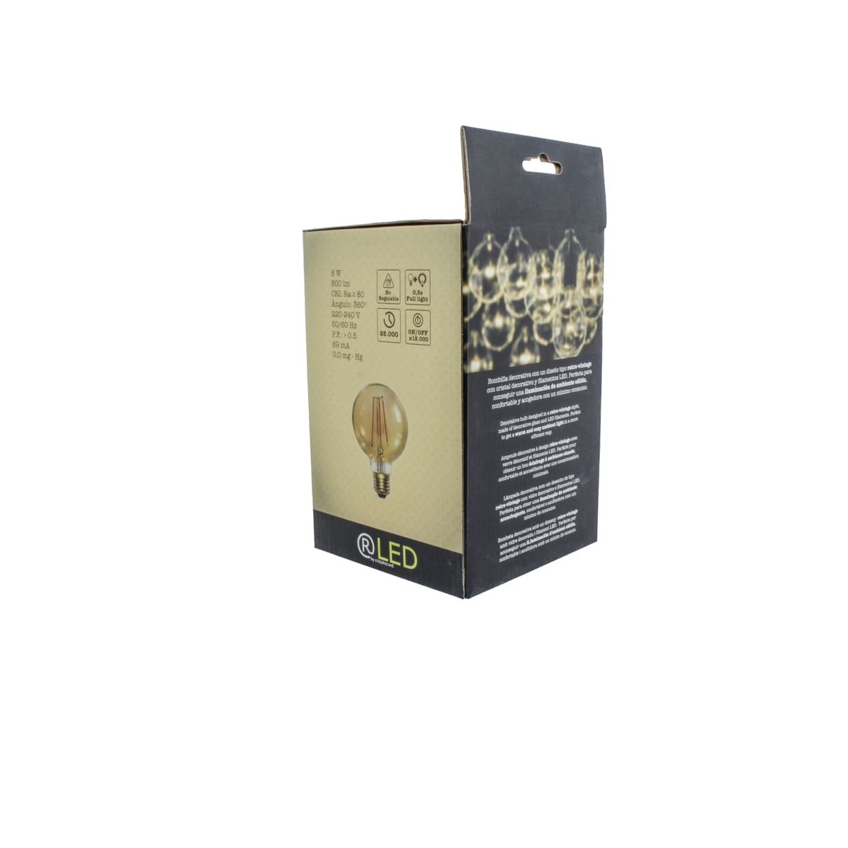 Bombilla decorativa con LED de filamento fabricada con vidrio en tono caramelo. Aporta a la estancia una agradable luz amarilla cálida de 2700K, con una potencia de 8W y una eficiencia lumínica de 100lm/W