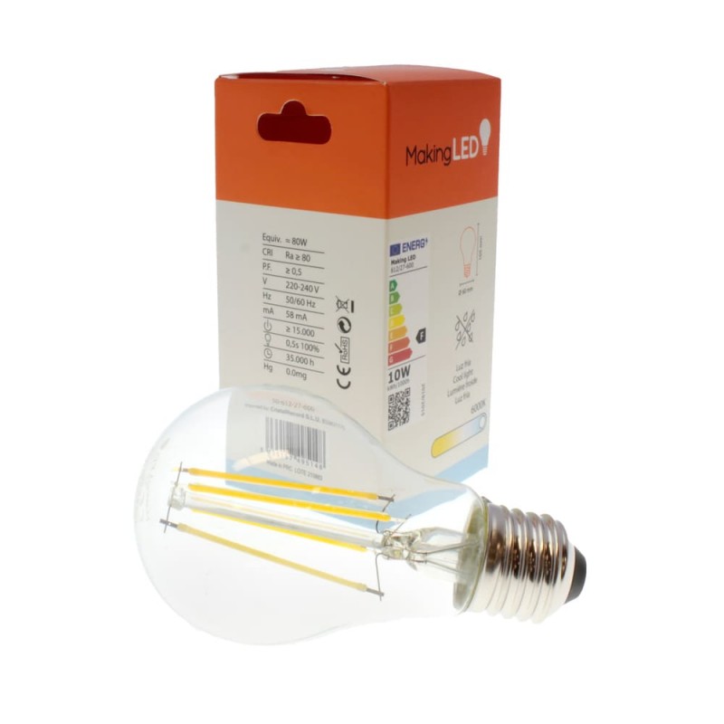 Bombilla de vidrio transparente con led de filamento regulable de 10W de potencia con flujo luminoso de 1200lm. Luz blanca fría.