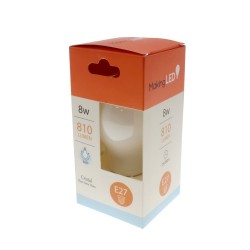 Bombilla de vidrio con acabado blanco brillo de 8W de potencia con flujo luminoso de 810lm. Luz blanca fría.