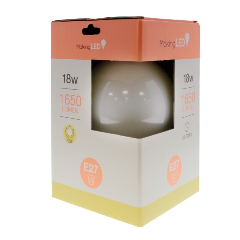 Bombilla LED globo de 120mm fabricada en PVC con difusor blanco mate. La bombilla de rosca E27 tiene una potencia de 18W.