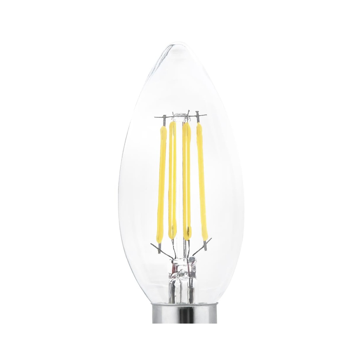 Bombilla vela de filamento LED decorativade 37mm con rosca E14. Bombilla de cristal transparente de 6W con luz blanca fria y un flujo luminoso de 800lm.