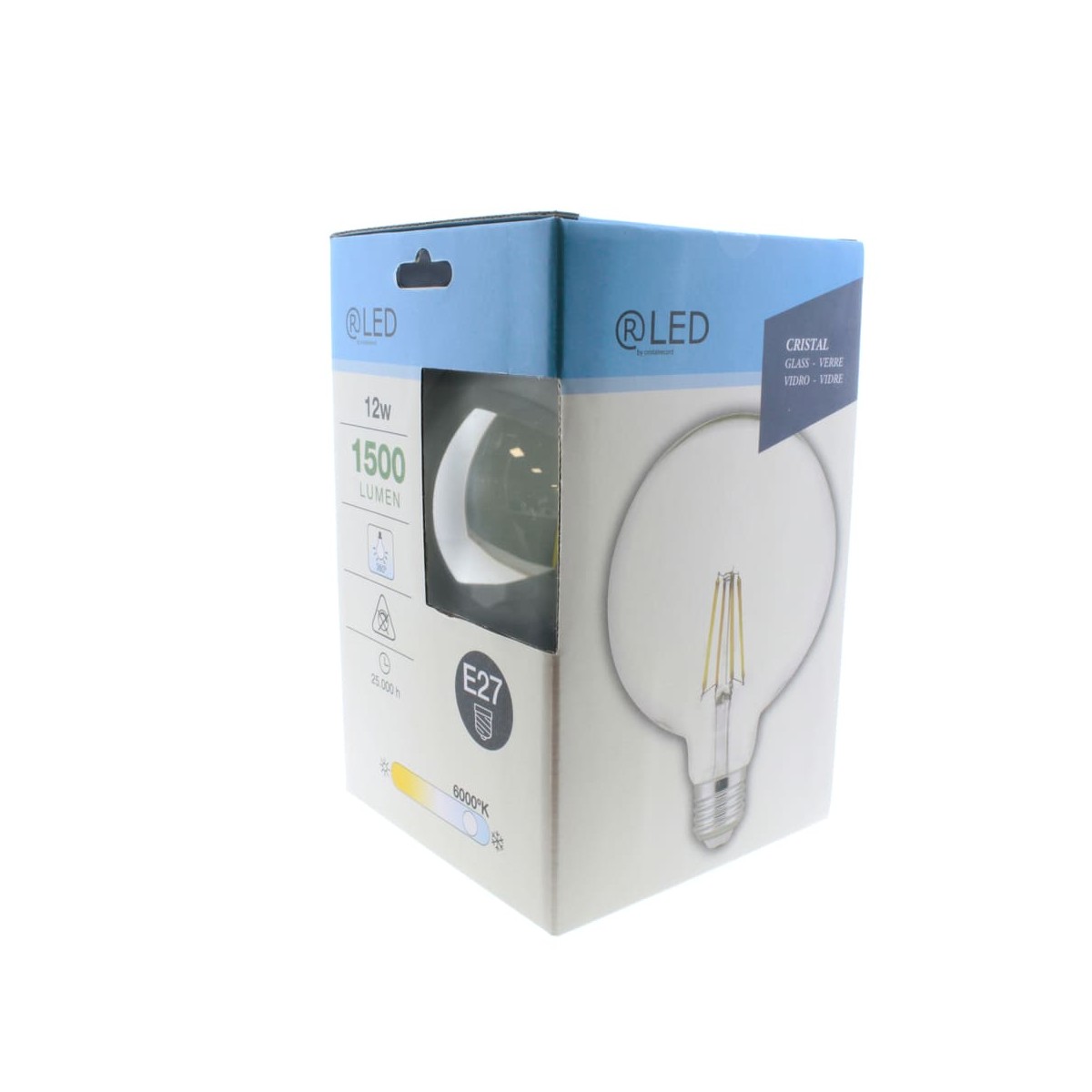 Bombilla decorativa globo G125 de cristal transparente. Led de filamento de 12W, 1500 lumenes con luz fría 6000K