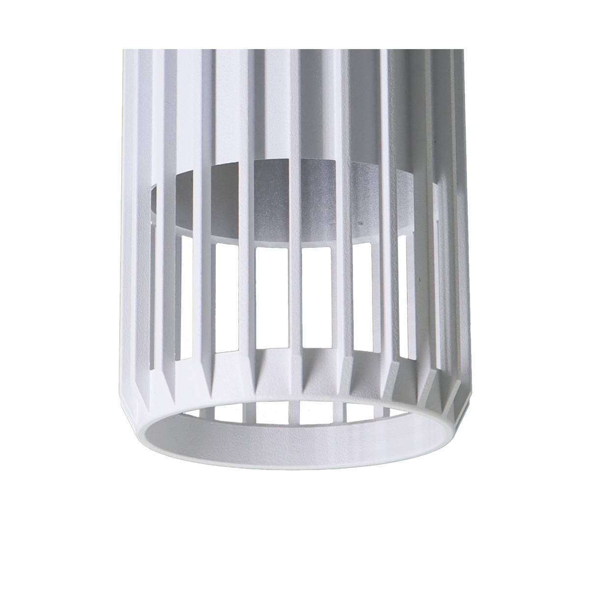 Foco de techo moderno para iluminación interior. Forma cilíndrica de aluminio blanco texturizado, con un diseño en relieve con parte inferior de rejilla. Diseñado para una iluminación decorativa y funcional de espacios de interior. Colección Sahara.