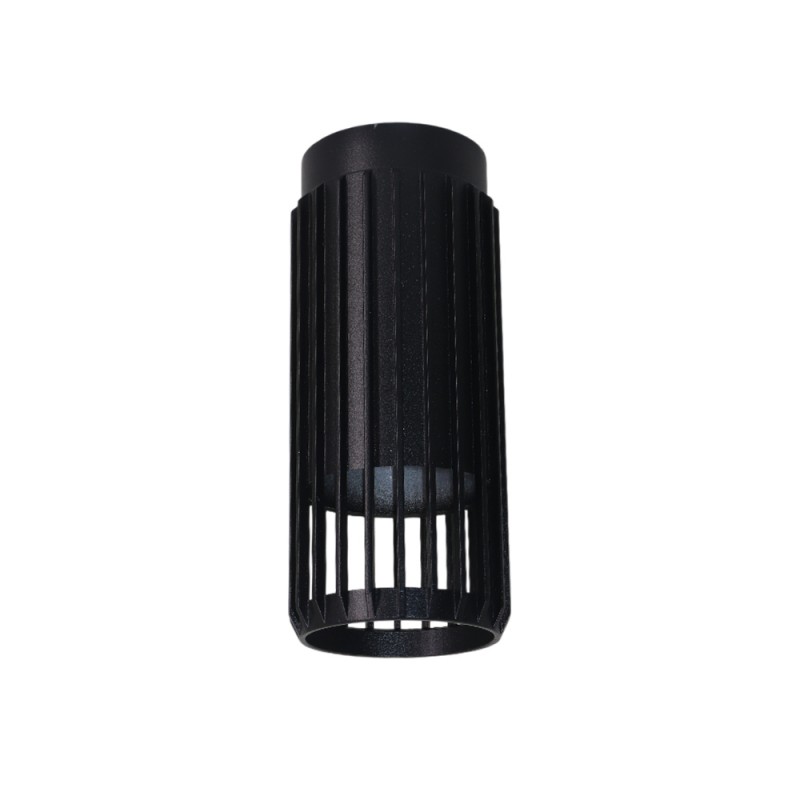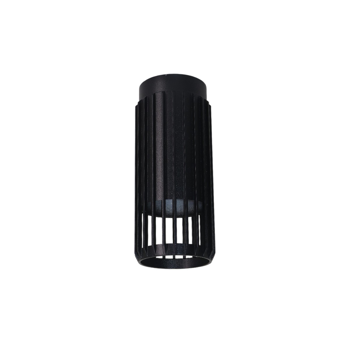 Foco de techo moderno para iluminación interior. Forma cilíndrica de aluminio negro texturizado, con un diseño en relieve con parte inferior de rejilla. Diseñado para una iluminación decorativa y funcional de espacios de interior. Colección Sahara.