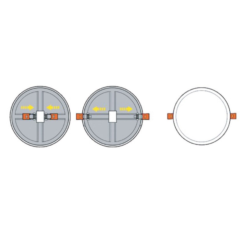 Downlight adaptable al agujero del techo. Los muelles de fijación pueden deslizarse adaptándose a todo tipo de agujero en el techo, desde un diámetro de 50 a 210mm sin necesidad de que sea regular. El diámetro exterior del downlight es de 230mm. Luz neutra 4000K